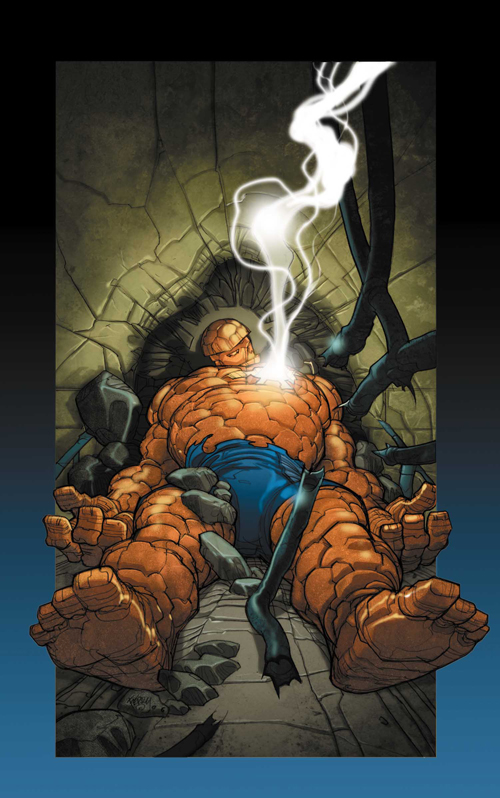 Stranded on the alien world called Acheron, the F.F. face certain death at the hands of the literally explosive being called Gallowglass! But even he pales besides the true enemy on this bleak planet, the greatest threat the multiverse has ever known: Thanos the Destroyer! Part 3 (of 6)