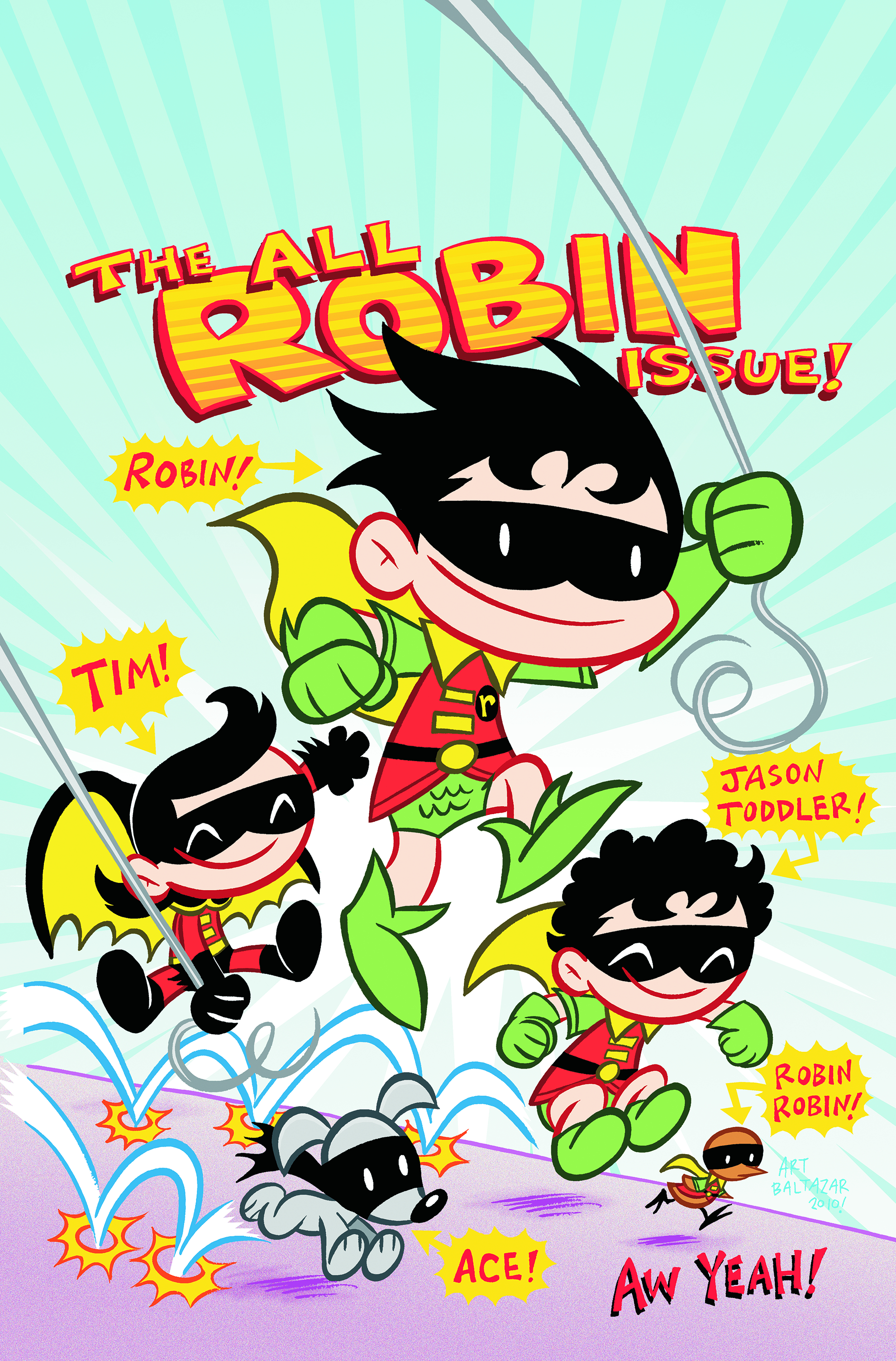 The all-Robin issue! What does The Boy Wonder do when there's more than one Robin walking around? Time to bring out the Nightwing costume, of course! Maybe a name change will be less confusing this time? Guest-starring Tim and Jason Toddler, Alfred, Ace, and the Robin Robin!