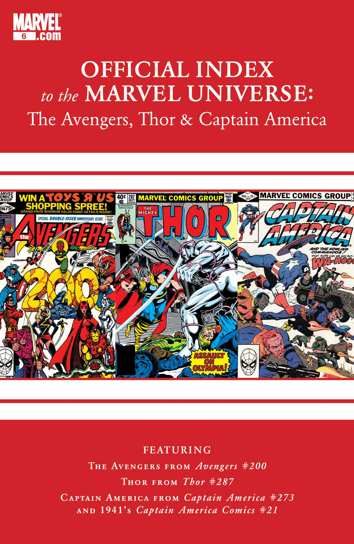 The chronicle of the Marvel Universe returns as the All-New Official Index to the Marvel Universe delves into the history of three more of Marvel's most enduring titles! Return with us to the Silver and Golden Ages to we launch our coverage of the Avengers (from AVENGERS #200), Thor (from THOR #287), and Captain America (from both CAPTAIN AMERICA #273 and 1941's CAPTAIN AMERICA COMICS #21). Watch the Marvel universe's history unfold month by month as each issue provides synopses for dozens of individual comics, including back-up strips, introducing the characters, teams, places and equipment that appeared within, providing vital information about first appearances, where they last showed up and where they appeared next!