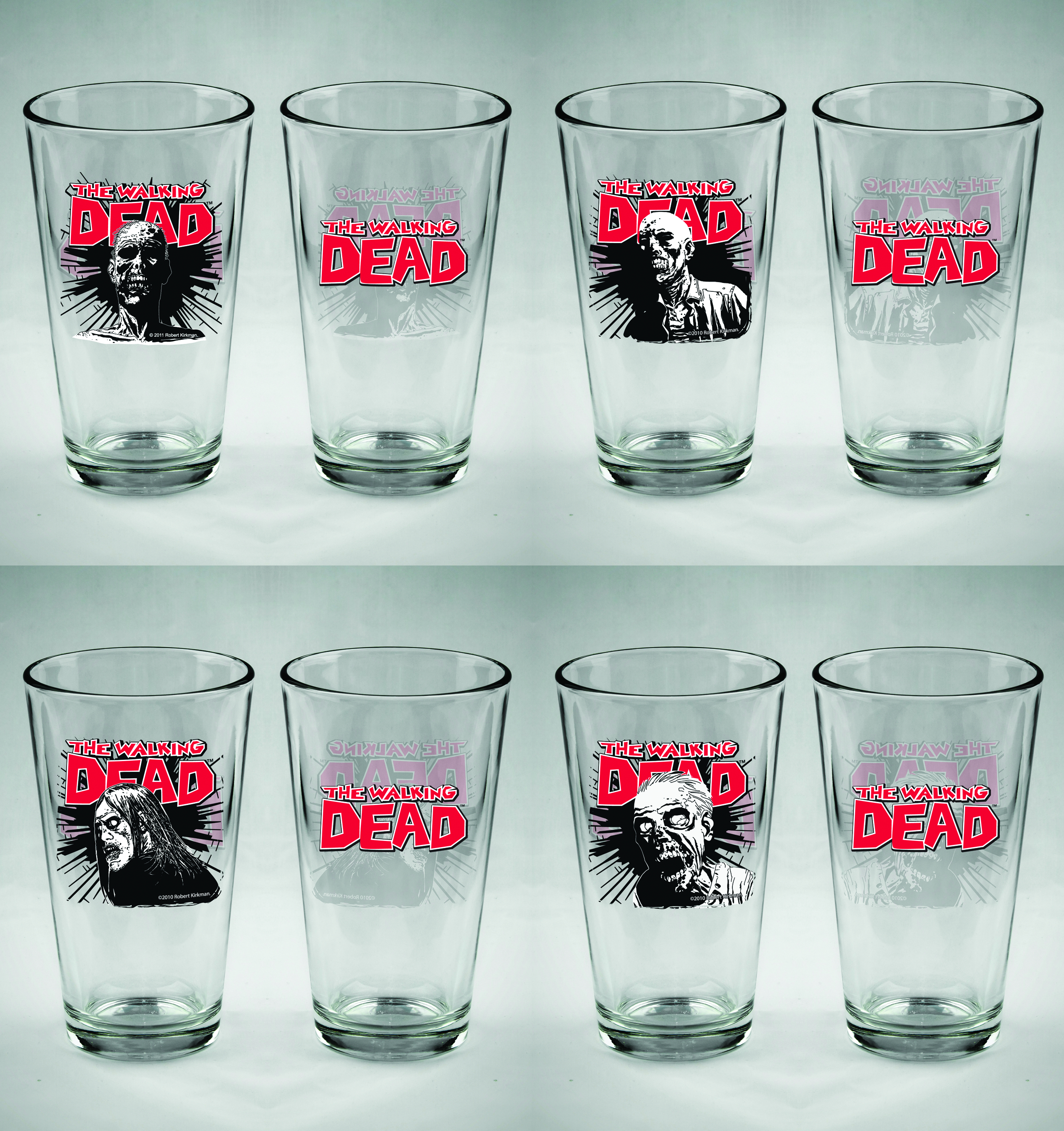 The Walking Dead, and Taverncraft celebrates the series with a new set of pint glasses, just in time for the holiday season! Each high-quality, screen-printed glass features iconic artwork from the hit zombie comic series. Each 16-ounce glass is packaged in a 4-glass color box.