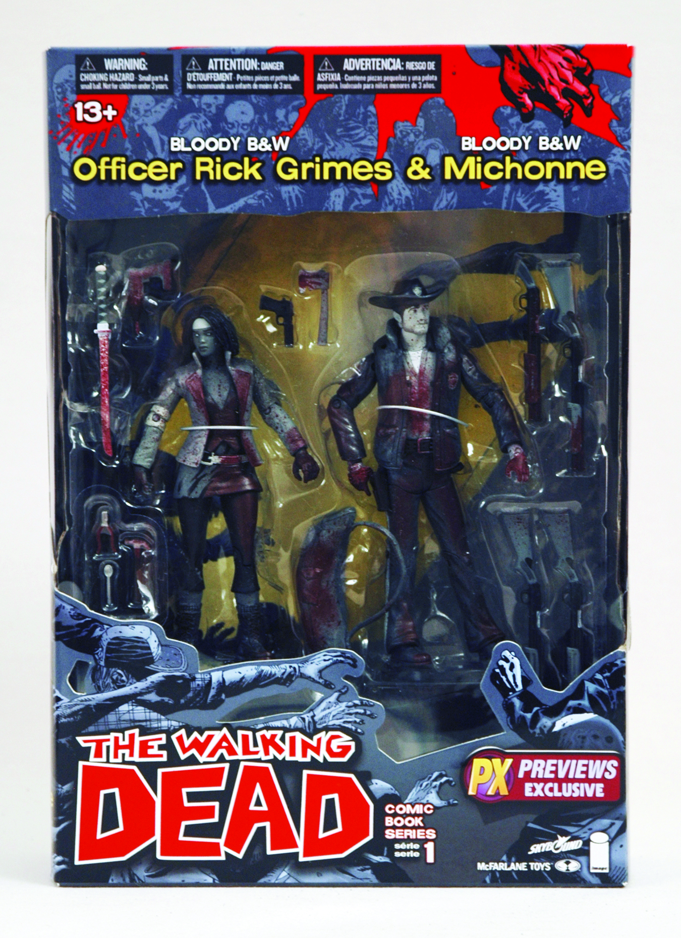 With civilization itself tottering after the outbreak of the zombie plague, fomrer police offier Rick Grimes leads a group of survivors in search of shelter and safety as zombie hordes roam the countryside in Robert Kirkman's best-selling comic book, The Walking Dead, from Image Comics. Fans of the series can add this PREVIEWS Exclusive two-pack to their collection with Officer Rick Grimes (includes bag of weapons) and Michonne (comes with sword and tools of revenge). Each figure is highly articulated and features a sculpt based on the artwork from the best-selling series.