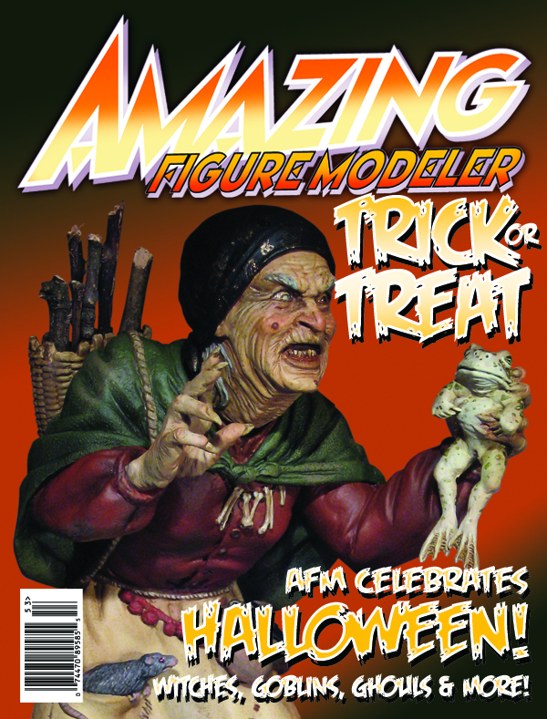 Amazing Figure Modeler Magazine this Fall and head out into the neighborhood for a beggar's night excursion that'll be nothing but modeling tricks and figural treats! It's time for Halloween and the AFM house is handing out some of the sweetest resin and plastic candy on the block. Steve Riojas will scare the yell out of you with a porch diorama that'll feature Kreature Kid's awesomely cool "Halloween Nightmares" gang. David Fisher takes an eye of newt and wing of bat to Tweeterheads' "Home Cookin", an epic Salem Witch kit that's certain to put a spell on you.