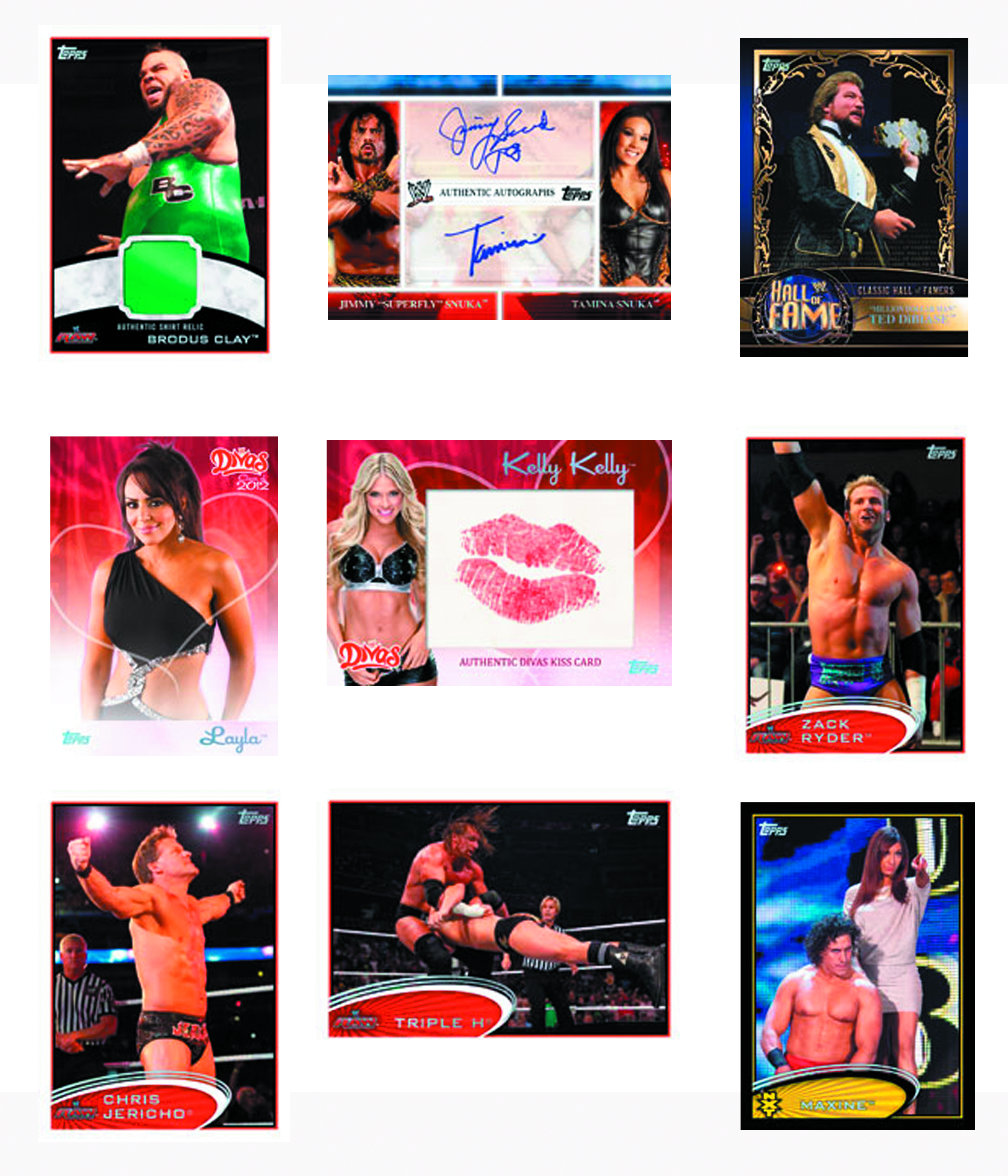 Topps 2012 WWE features the superstars, divas, and legends from one of the most thrilling years in WWE! All of the excitement of 2012 is spotlighted in a premium, foil-stamped 90-card base set, complete with text by fan-favorite superstar Mick Foley! Collectors will find Blue-Bordered, Gold, Black-Bordered, Platinum-Bordered, and Printing Plate Parallel cards. Plus, Hall of Famers, Divas Class of 2012, World Class Events, First Class Champions, and Top Class Matches insert cards. There are also Autograph cards, Sketch cards, and Relic cards. 7 cards per pack, 24 packs per box.