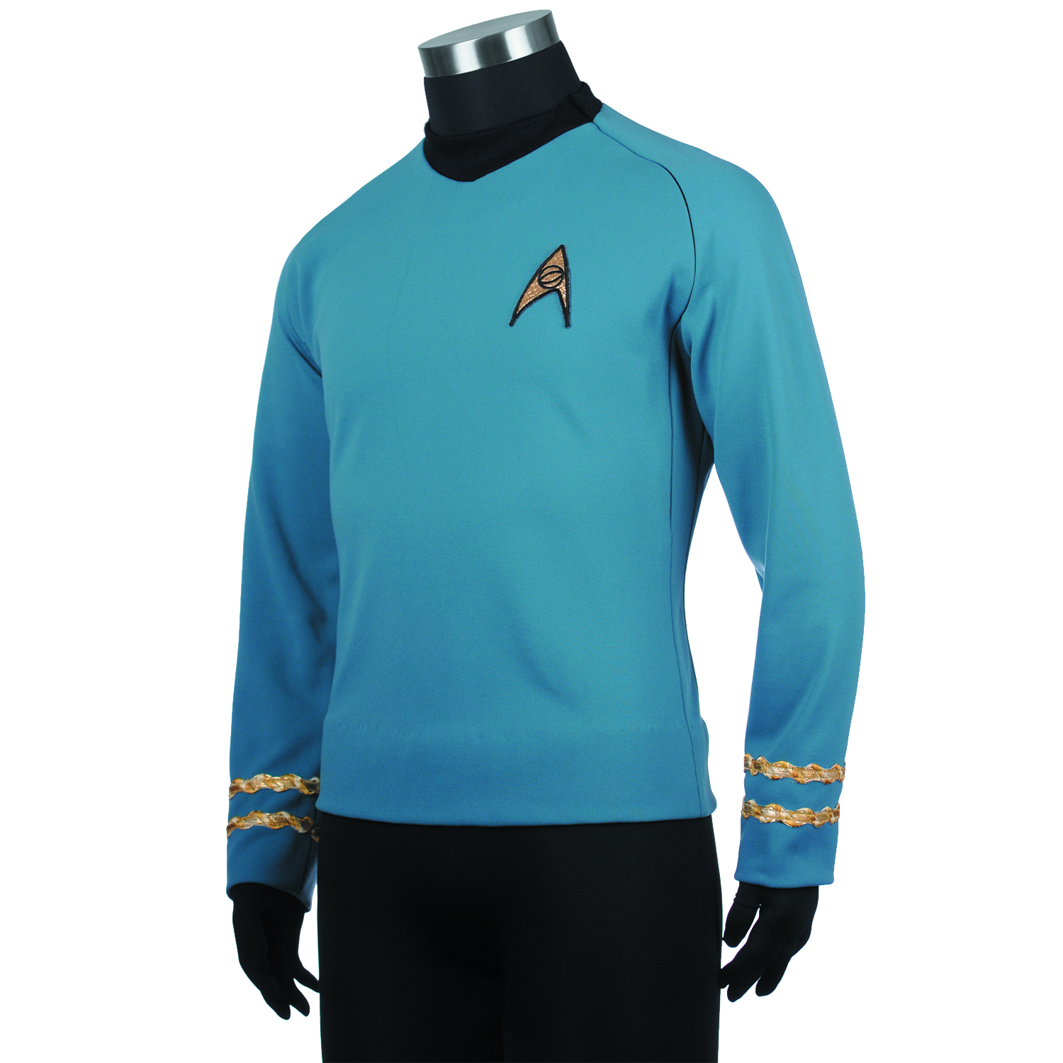 ANOVOS' Star Trek: The Original Series - Spock Replica Tunic is a highly accurate recreation of the uniform top worn by Leonard Nimoy during the third season of the original Star Trek series. Using the exact double-knit fabric, elusive diamond-weave neck material, and patterns drawn from a screen-used hero Spock uniform, this tunic will meet every fan expectation even to the most critical eye. ANOVOS offers this exacting replica in Mr. Spock's style with Commander braid formation, containing two full braids for each sleeve. Each tunic features the Science Division Delta Shield Enterprise patch. Taking a page from Spock's "I endeavour to be accurate", ANOVOS recreates only the best of costume replicas. To pass on this would be, simply put, highly illogical!