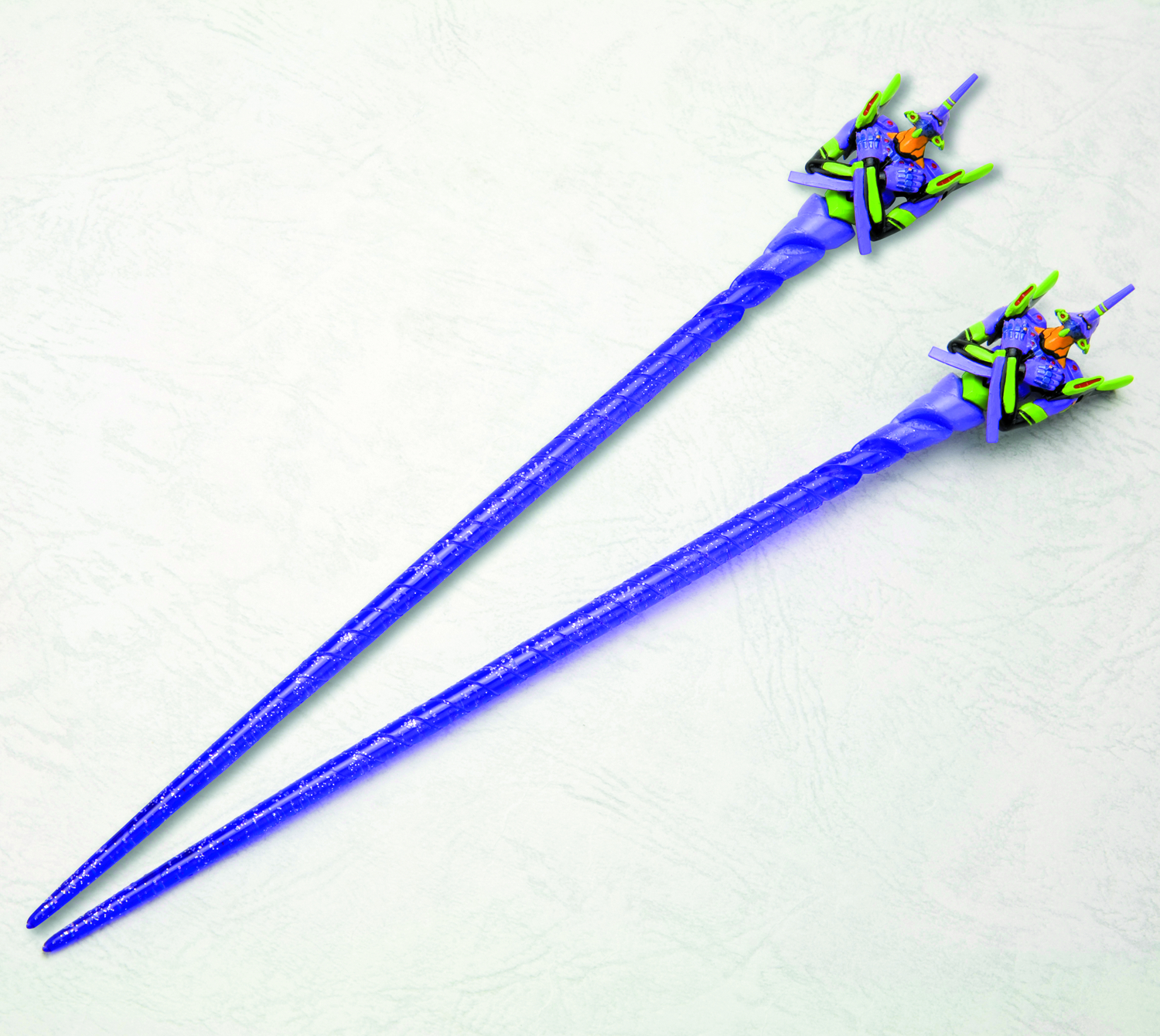 Evangelion Mark 6! Unique, fun, and innovative, these glittering utensils (violet and green Eva-01 and blue, gray, and yellow Mark 6) are semi-translucent and make for a striking addition to any dining experience. Each set of chopsticks measures 9" long with the eating utensil extending from the Eva's torso.