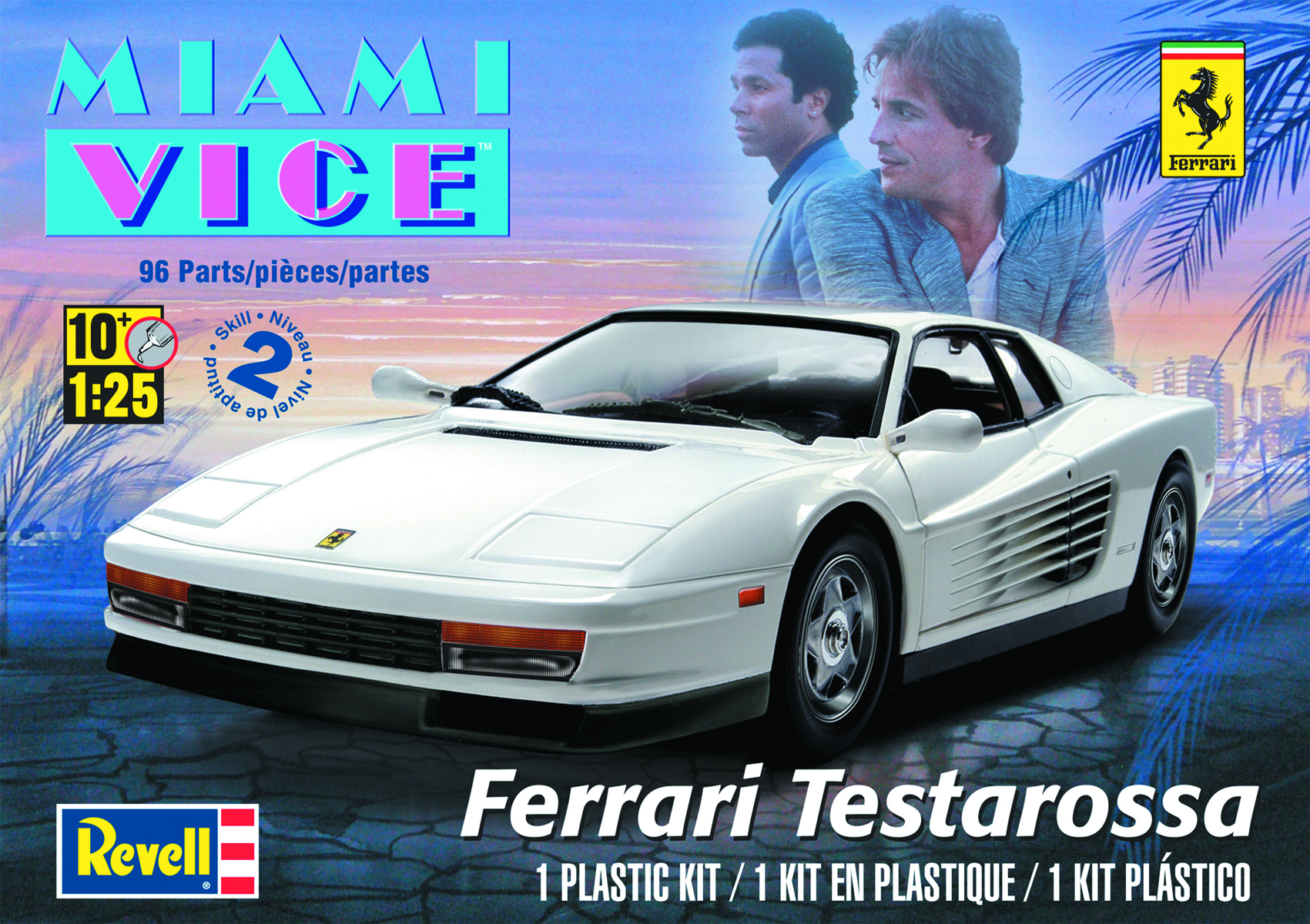 Miami Vice was a groundbreaking television series. In its own way, the Ferrari Testarossa was a groundbreaking car. With its 5-liter DOHC 12 cylinder "Boxer" style engine producing 380 horsepower, the Testarossa was the fastest production car of its day. While the car Ferrari originally sent the film crew was black, the Miami Vice Testarossa was painted white to stand out against the night sky. The kit features lifting rear hatch and full detail 12 cylinder "Boxer" engine, separate side louver panels, and detailed suspension system with dual rear shock/springs. Skill level 2, glue and paint required.