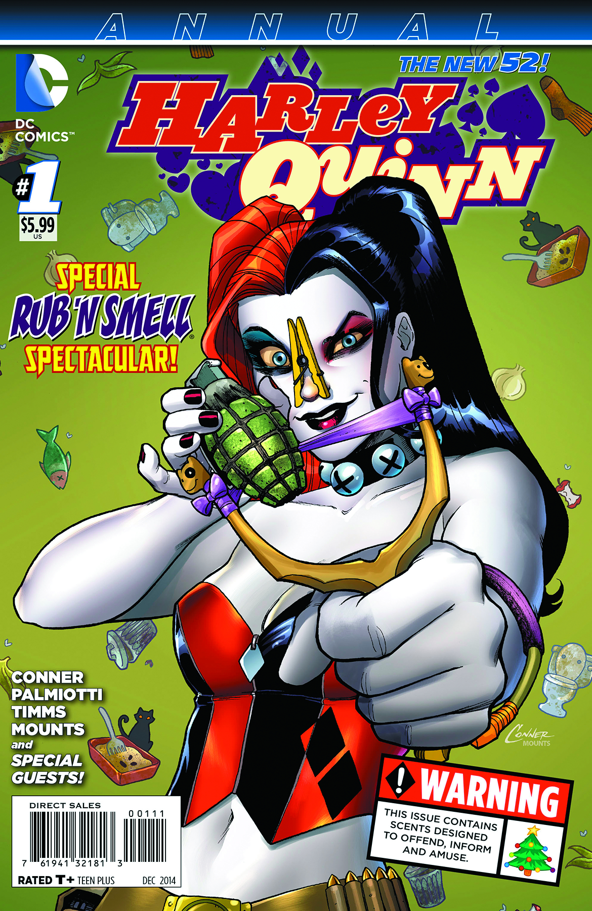 We have to warn you, readers: This issue stinks! Seriously! Like, unpleasant odors are literally in the story! In this first-ever HQ ANNUAL, take a trip to Harley's home of Coney Island in a groundbreaking "scent-ticular" issue, featuring actual, honest-to-gosh smells. This issue comes polybagged to contain the stench.