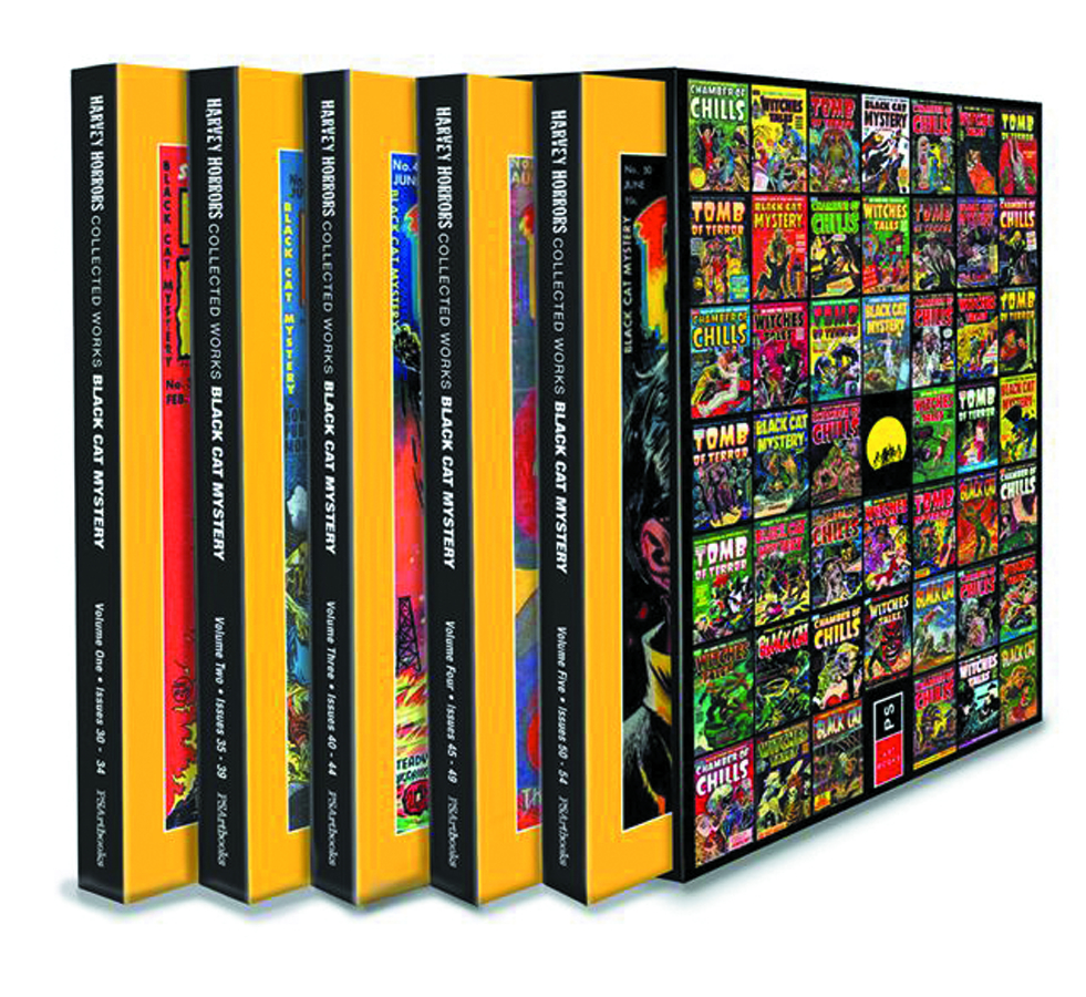 Black Cat Mystery, in five beautiful paperback editions in a gorgeous illustrated slipcase. This set collects Volume 1 (issues #30-34, Aug 1951 - Apr 1952), Volume 2 (issues #35-39, May 1952 - Sept 1952), Volume 3 (issues #40-44, Oct 1952 - June 1953), Volume 4 (issues #45-49, Aug 1953 - Apr 1954), and Volume 5 (issues #50-53, June 1954 - Dec 1954).