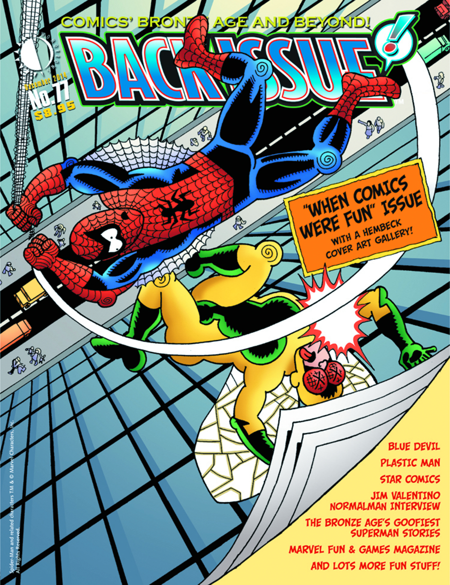 Back Issue lets you return to a time when comics were fun! Fred Hembeck cover gallery, Plastic Man, Blue Devil, Marvel's Star Comics imprint, Jim Valentino's normalman, the Bronze Age's goofiest Superman stories, Marvel Fun & Games Magazine, and the Batman/Dick Tracy team-up you didn't see! Featuring the work of max allan collins, paris cullins, ramona fradon, alan kupperberg, dan mishkin & gary cohn, steve skeates, joe staton, curt swan, and more. With a Hembeck recreation of his classic Spectacular Spider-Man #86 cover.