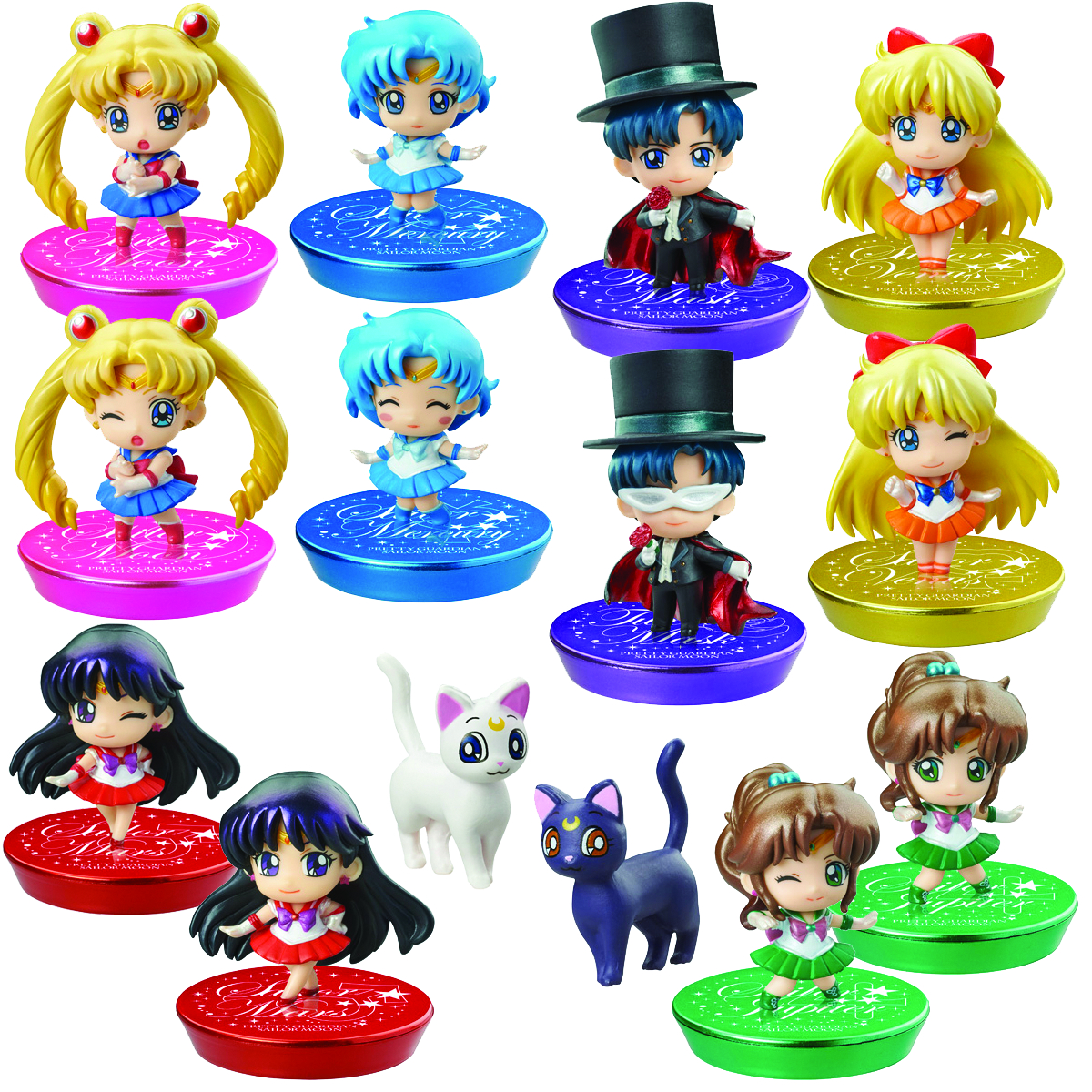 Sailor Moon, Sailor Mars, Sailor Mercury, Sailor Venus, Sailor Jupiter and Tuxedo Mask! Collect them all! Blind mystery packaging.