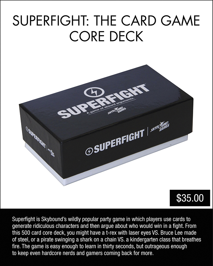 Superfight is Skybound's wildly popular party game in which players use cards to generate ridiculous characters and then argue about who would win in a fight. From this 500 card core deck, you might have a t-rex with laser eyes VS. Bruce Lee made of steel, or a pirate swinging a shark on a chain VS. a kindergarten class that breathes fire. The game is easy enough to learn in thirty seconds, but outrageous enough to keep even hardcore nerds and gamers coming back for more.