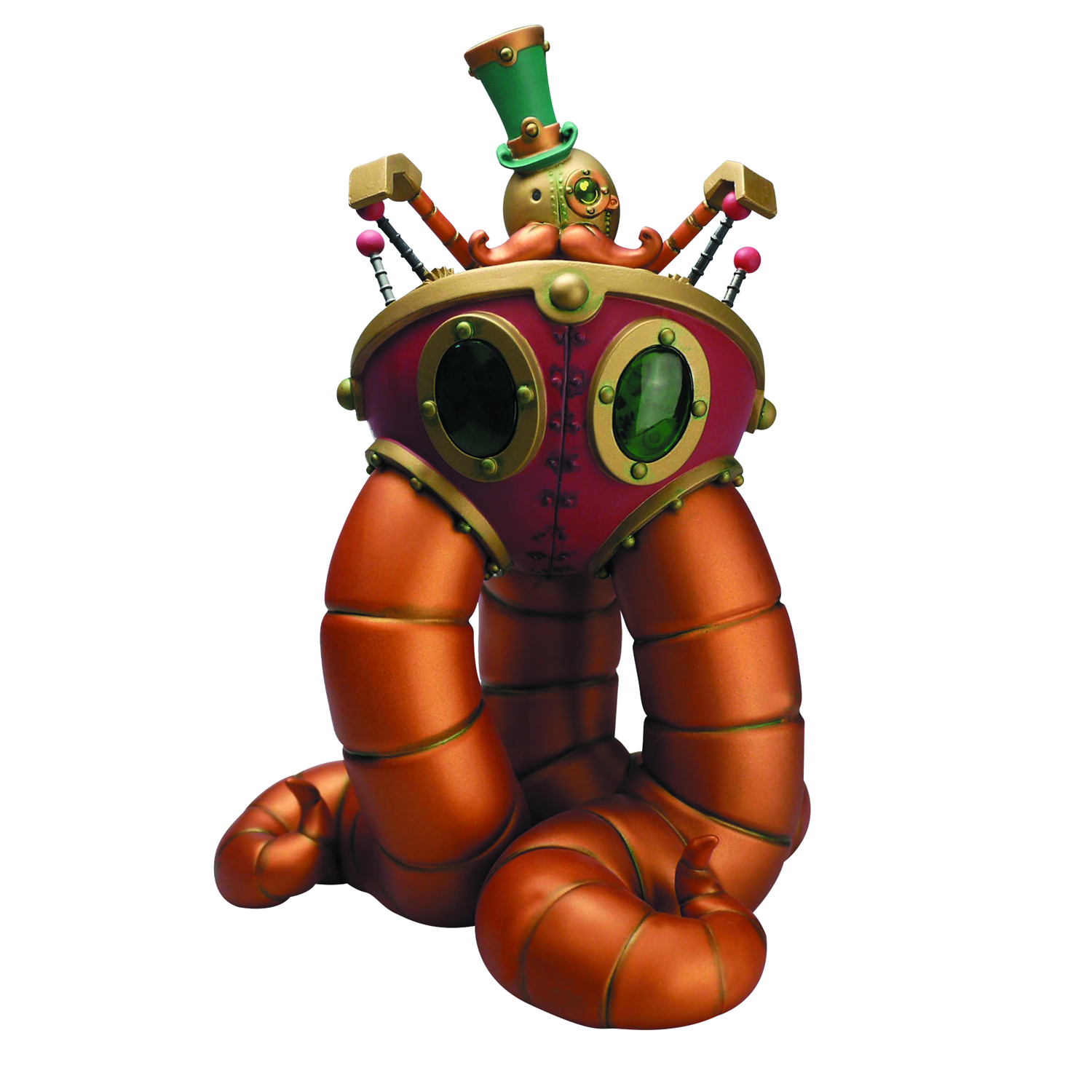 Mr. Pumfrey and His Astounding Mechanised Perambulator. Standing 8" tall, the Perambulator features clear lenses that house inner gears, lots of detailed paint apps, and a removable Mr. Pumfrey. Doktor A pulls from the classic steampunk color palette of maroons, greens, copper, and brass to create a piece befitting the genre. Following the sold-out colorways of Autumn Amble, Winter Wanderland, and Spring Stroll, the final colorway of Summer Saunter completes the seasonal theme of the series. Limited to 400 pieces.
