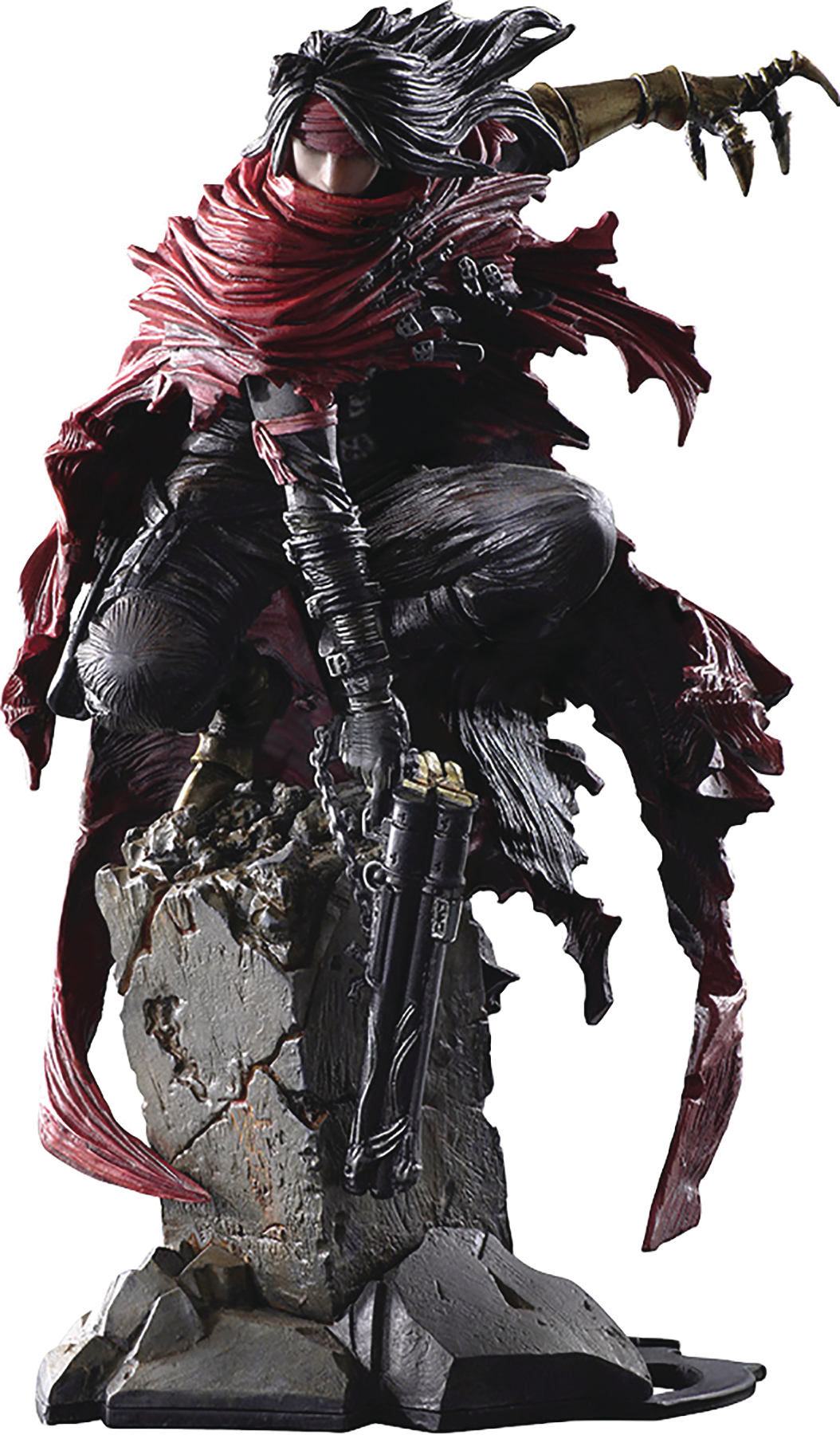 Final Fantasy VII: Advent Children. Perched atop a pile of rubble and brandishing the custom tri-barrelled handgun Cerberus, Vincent's long hair and cape blow dramatically in the wind while his stance hints at his awesome superhuman abilities and mysterious personality. In addition to a design with a clever awareness to depth, the contrast between different areas is beautifully brought out through subtle coloring, and comes together to create a masterful piece with an overwhelming sense of presence.