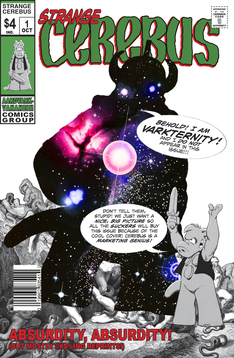 First (and last?) appearances of Varkternity (Vark-Finite?) and Galactamungus (who mentions Platinum Surfer-Boy); the CIH? house drummer; reprints online strips from July-August 2016: Super-Cerebus Revenge Squad; The Whore of Babylon gets a tattoo; MILESTONE! the first time Dante suspected Cerebus and Super-Cerebus were one and the same! LeonTrotzky; Plato vs. Aristotle; Obama voters; MILESTONE! Super-Suberec, the Anti-Super-Cerebus and Cerebus go to Starbucks; hardcore Madonna fans;
