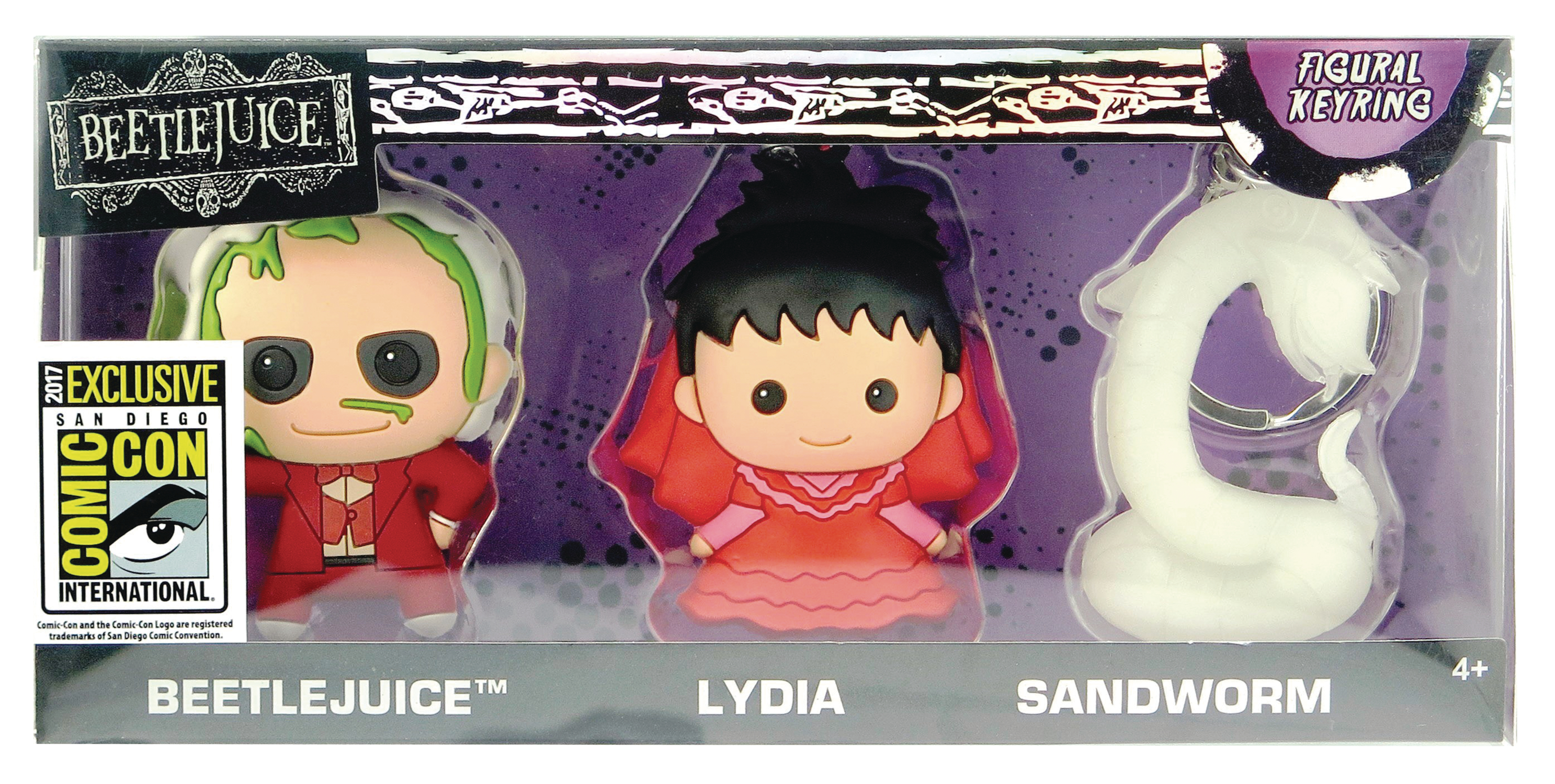 Beetlejuice 3D Foam Key Ring Set! The this 3-piece collection contains Beetlejuice in his Wedding Suit, Lydia Deetz in her Red Wedding Dress, and a rare translucent Sand Worm. Window box packaging.