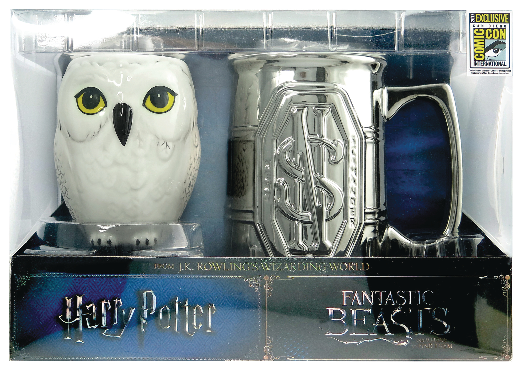 Fantastic Beasts Mug Set will hold your drinks with style! The San Diego Comic-Con exclusive set comes with a white Hedwig Owl Mug and the first ever made silver embossed Newt Scamander Mug.