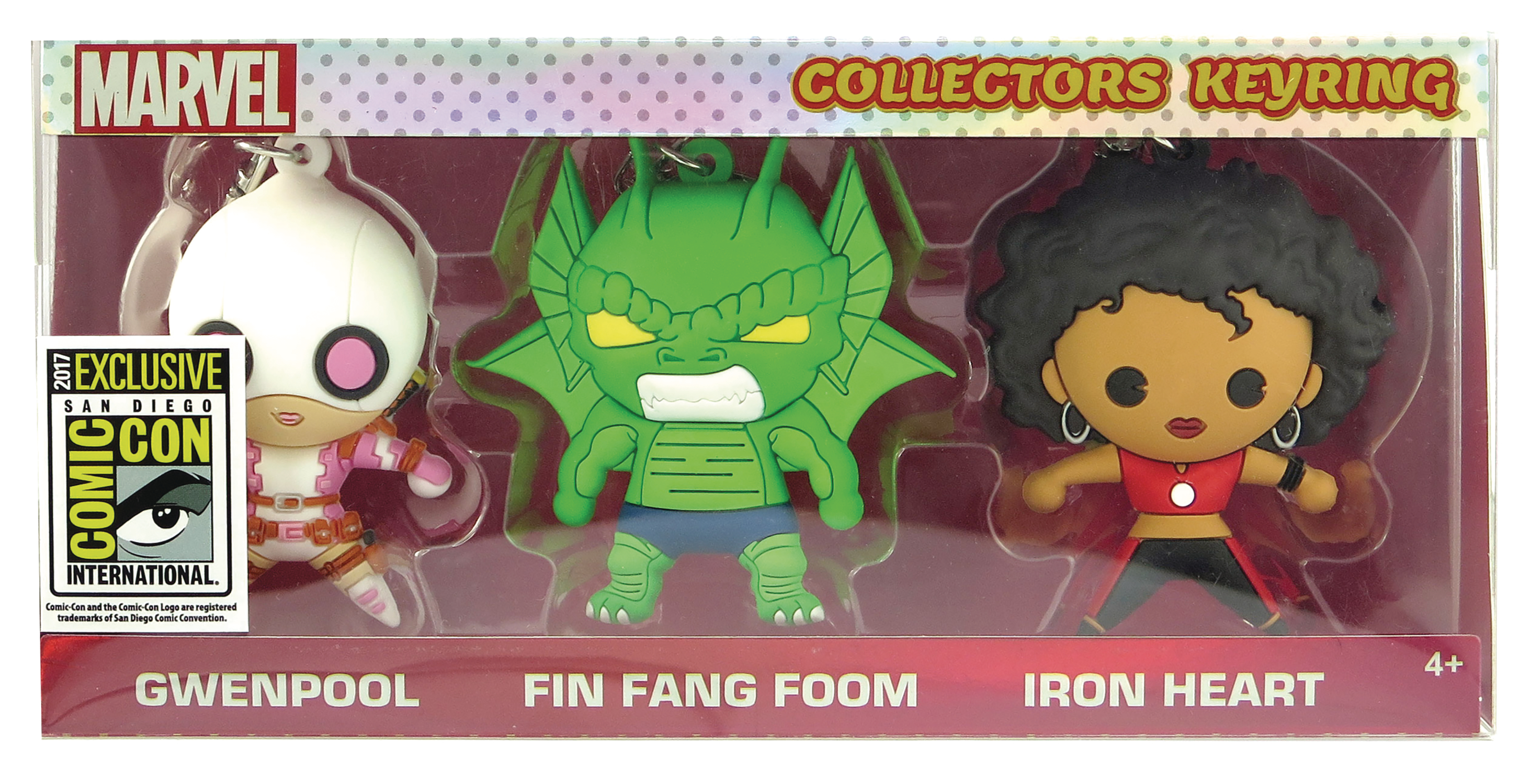 The wacky Gwenpool and brilliant Riri Williams, plus the big, bad, green space dragon whose Marvel Comics career spans more than 50 years, Fin Fang Foom! All three are making their debut as foam keyrings from Monogram. Window box packaging.