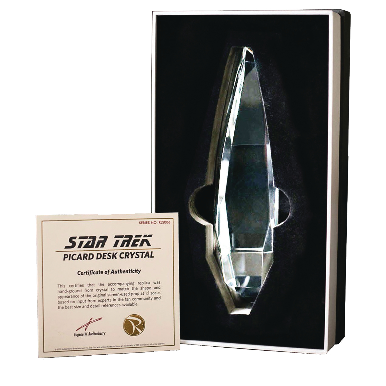 Star Trek: The Next Generation, often in his hands during the iconic speeches on moral and ethical issues that are so fundamental to the character of Star Trek's most ruminative captain. This re-creation is made of high-end lead crystal and its impressive heft makes it suitable for use as a paperweight, as its prismatic properties glimmer and sparkle in the light. The crystals are each meticulously formed, wet-ground, and polished by hand at a company that specializes in fine crystal glassware and chandeliers. The 3D geometry of the crystal was obsessively reconstructed using digital 3D modeling software, referencing and reconciling hundreds of film frames of the crystal's appearances across the seasons of TNG. This first installment in a planned three-piece Picard Desk Set has been produced in limited quantities, so don't miss this opportunity to assemble the full set.