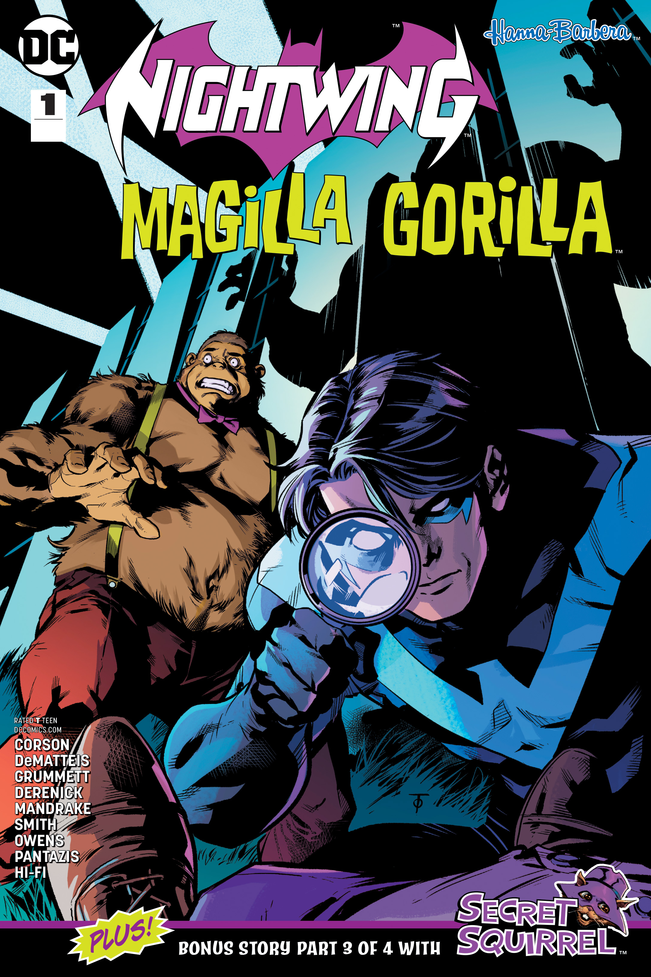 When a famous Hollywood talent agent is found brutally murdered, suspicion and evidence seem to point to his most famous client, Oscar winning actor Magilla Gorilla. Dick Grayson, already in Tinseltown to meet with said agent, senses something suspicious. Donning his Nightwing costume and joining forces with the simian suspect, he's got one night to prove that this monkey doesn't belong in a cage. Plus, part three of a Secret Squirrel backup story written by J.M. DeMatteis.