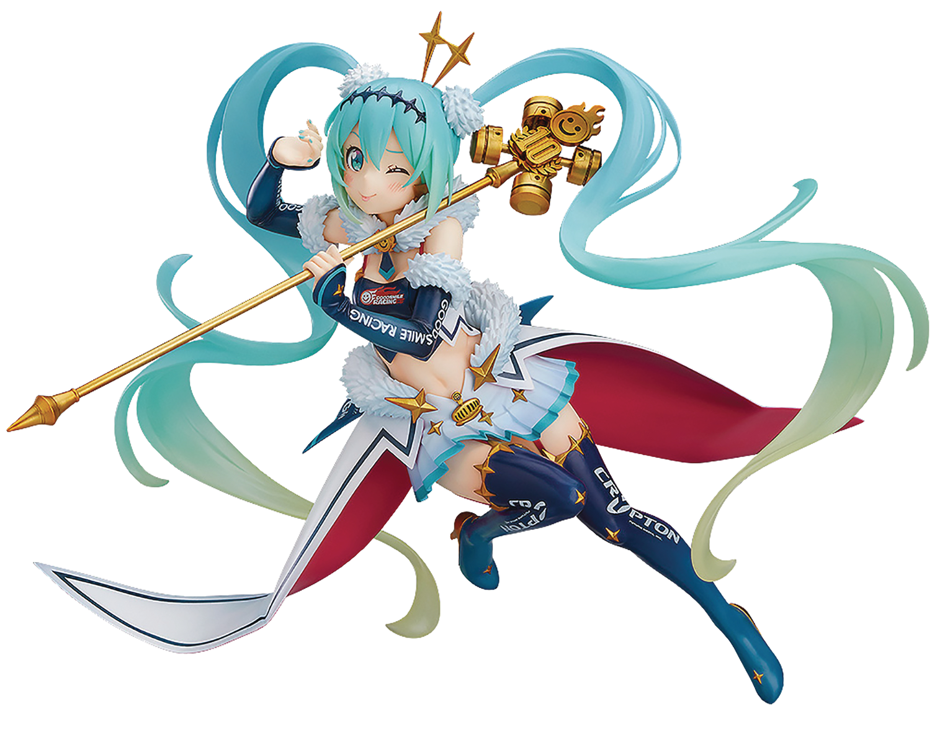 Racing Miku, has arrived as a 1/7-scale figure! This year's illustration by popular illustrator Hiro Kanzaki has been transformed into a figure packed full of impressive detail. Her cute, mischievous expression with her tongue sticking out has also been captured in figure form. Translucent parts are utilized for her hair, giving it a somewhat see-through appearance at the ends.