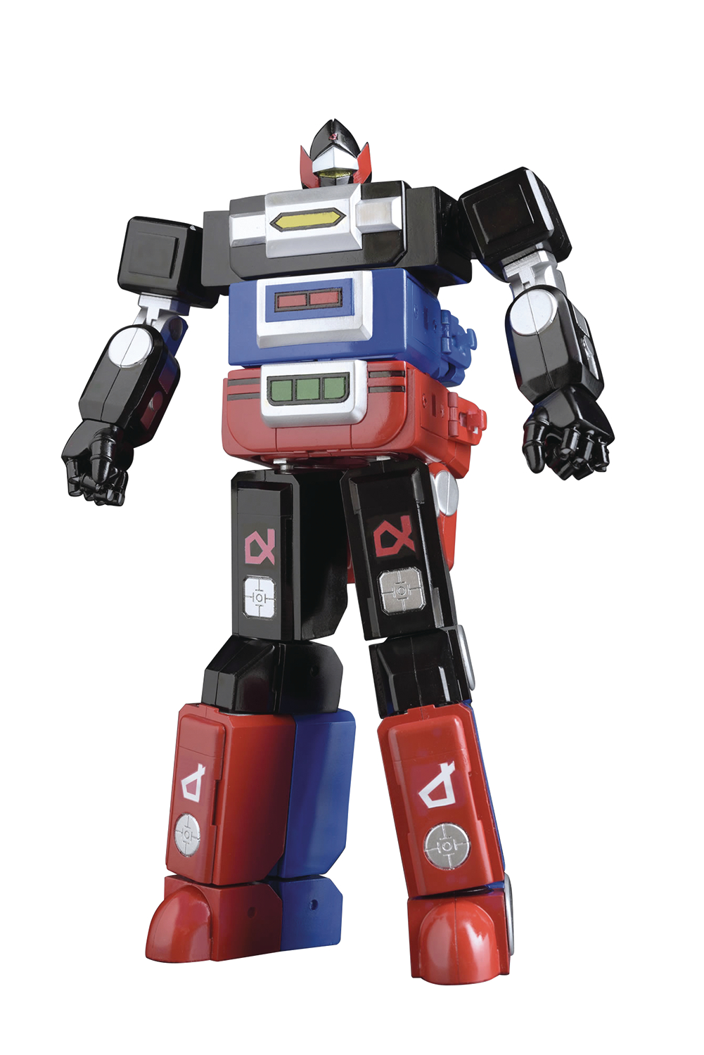 Grand Action Big Size Model line-up. This model is full action, 11 3/4" tall, and made of ABS, PVC and die-cast metal. You will find in the box the 3 robots, Alpha, Beta and Gamma, that can be combined to form the huge robot Albegas! Each one of the small robots comes with a set of interchangeable hands and sword. Also a set of interchangeable hands is included for Albegas. Denjin Kung-Fu, Denjin Arrow, Denjin Lancer and Denjin Cutter are all included, as well as a set for each type (robot form and fighter form) of New Super Avega.