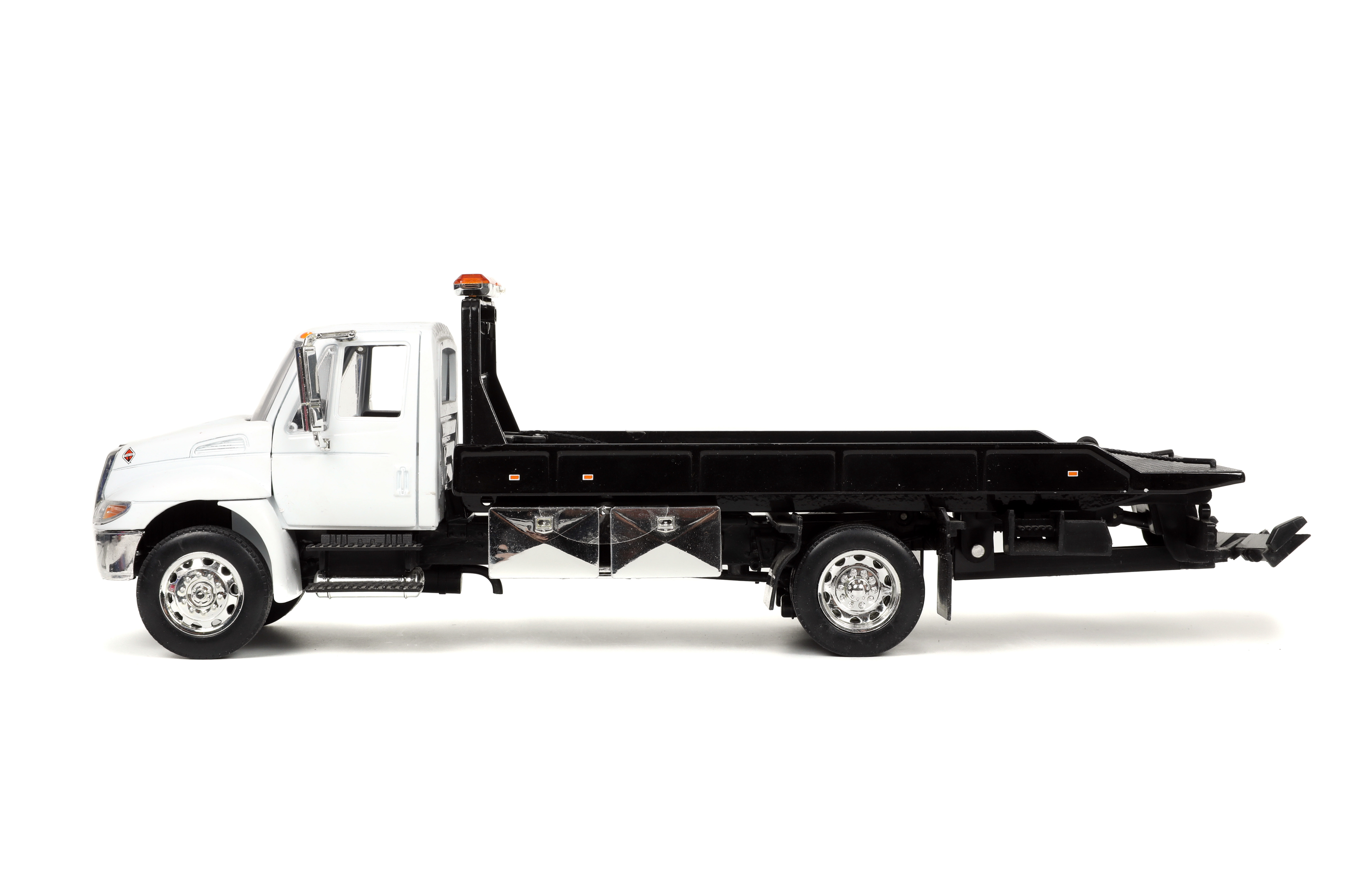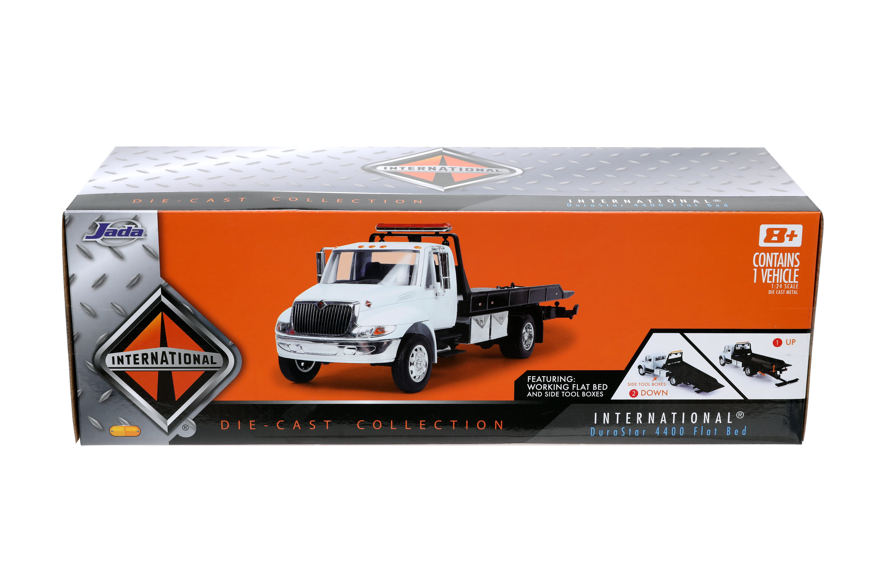 From Jada Toys. Make an impression with this awesome tow truck from Jada Toys! This International DuraStar 4400 Flatbed Tow Truck is a 1/24 scale model replica. It comes in white and features openable hood and doors, working flatbed and side tool boxes. It's an exceptional selection for any tow truck collection, and wonderful for faithful International admirers!