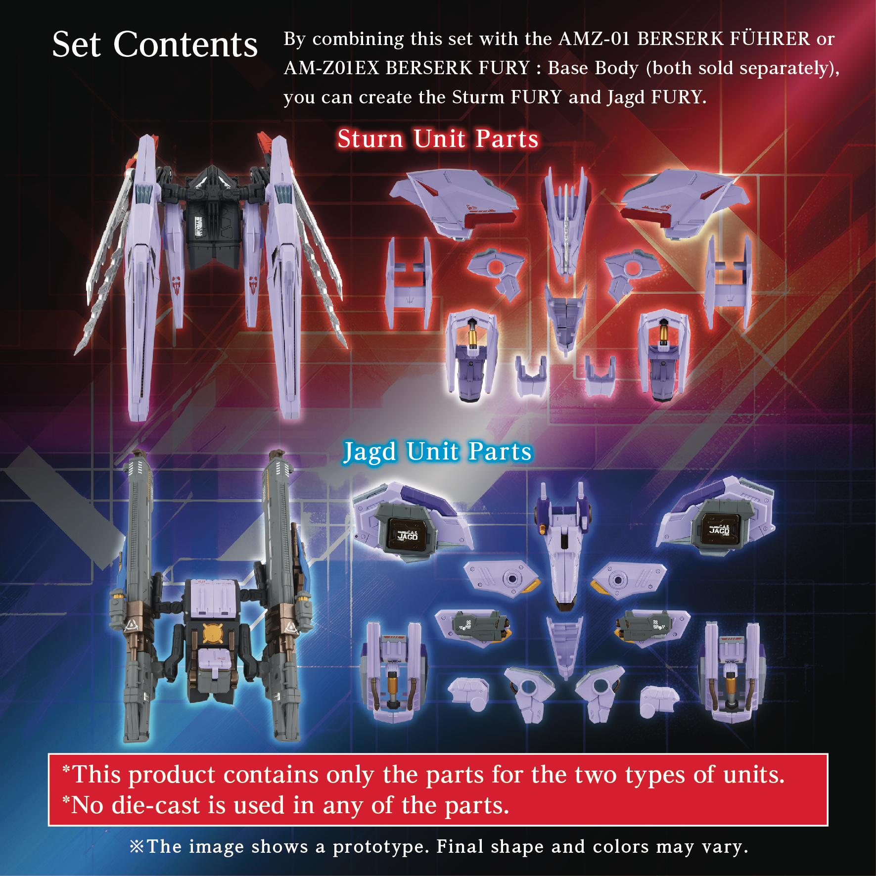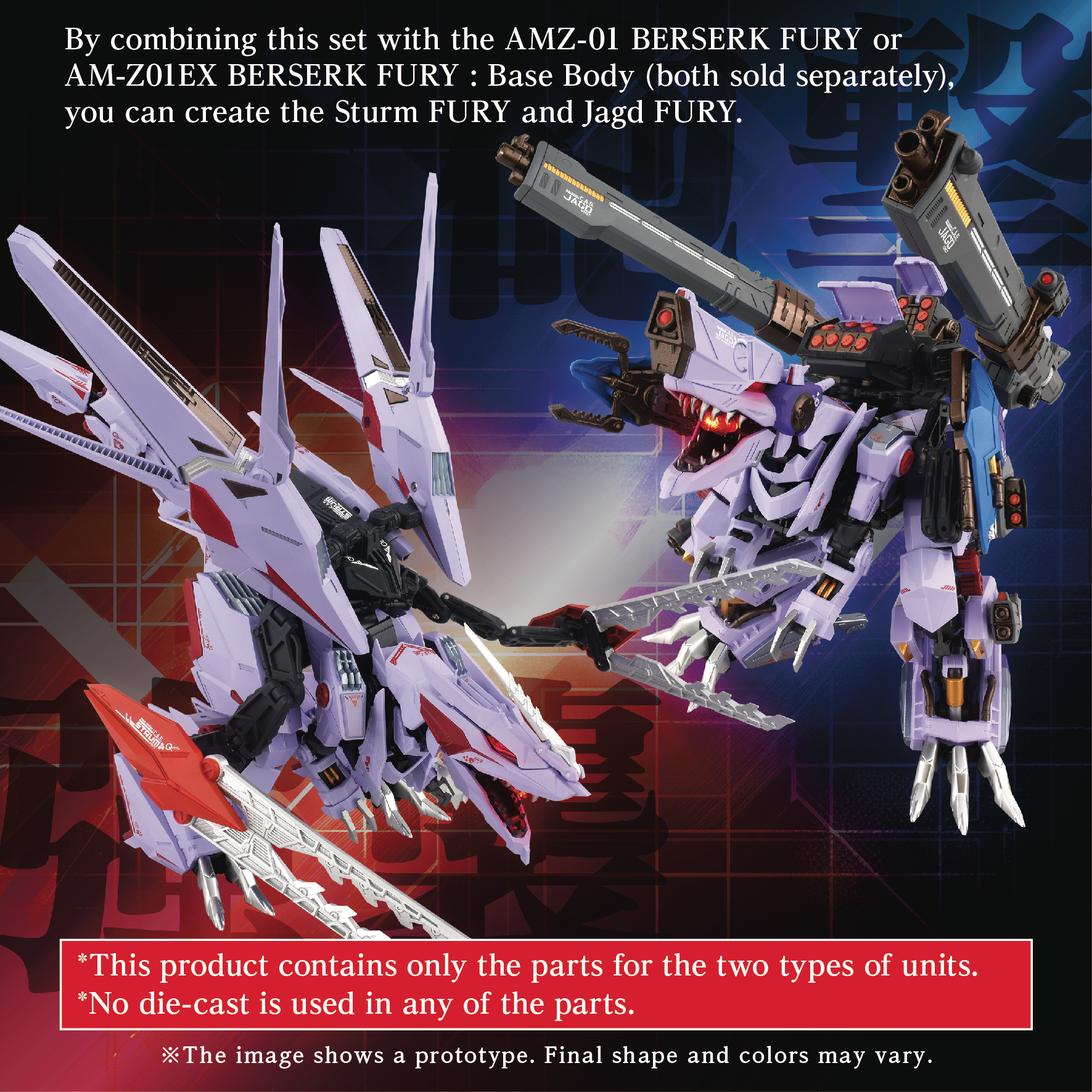 Combine with either the "AMZ-01 Berserk Fury" (sold separately) or the "AM-Z01EX Berserk Fury (Base Unit)" (sold separately) to recreate the "Sturm Fury" and "Jagd Fury". The "Jagd Unit" is being realized in 3D for the first time.