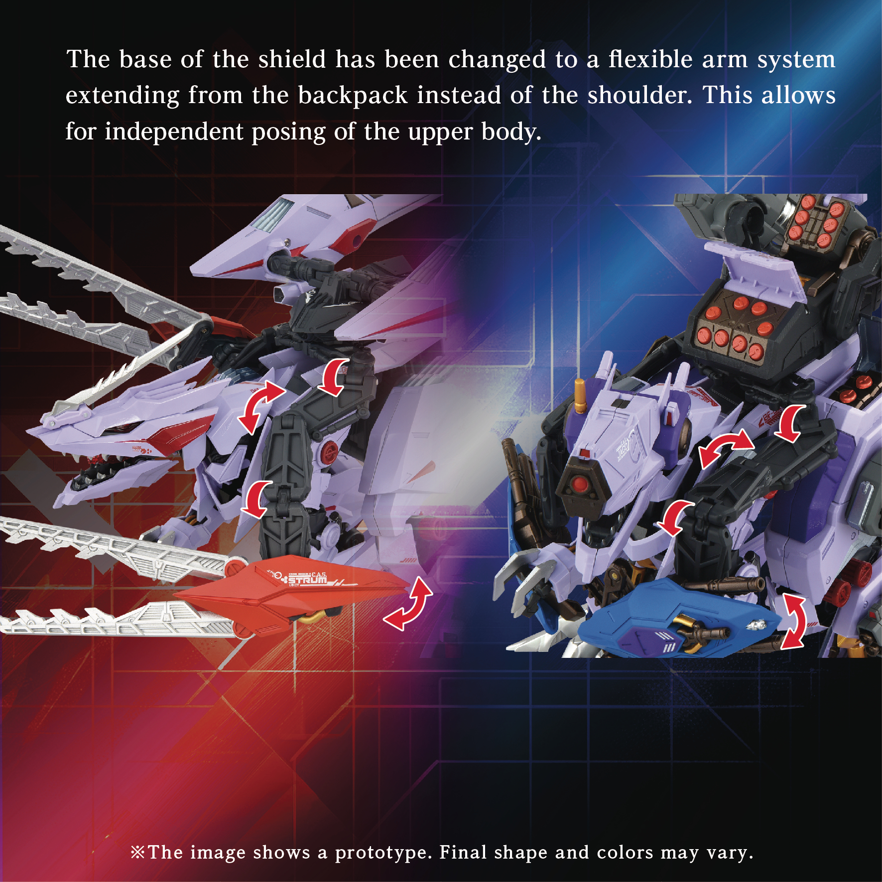 The "STURM FURY" features a linked opening/closing gimmick for the Sturm Boosters and movable Ex-Breaker arms via flexible joints. The "JAGD FURY" features a linked telescoping gimmick for the Hybrid Variable Cannon, opening/closing missile pod hatches, and movable sub-arms via flexible joints.
