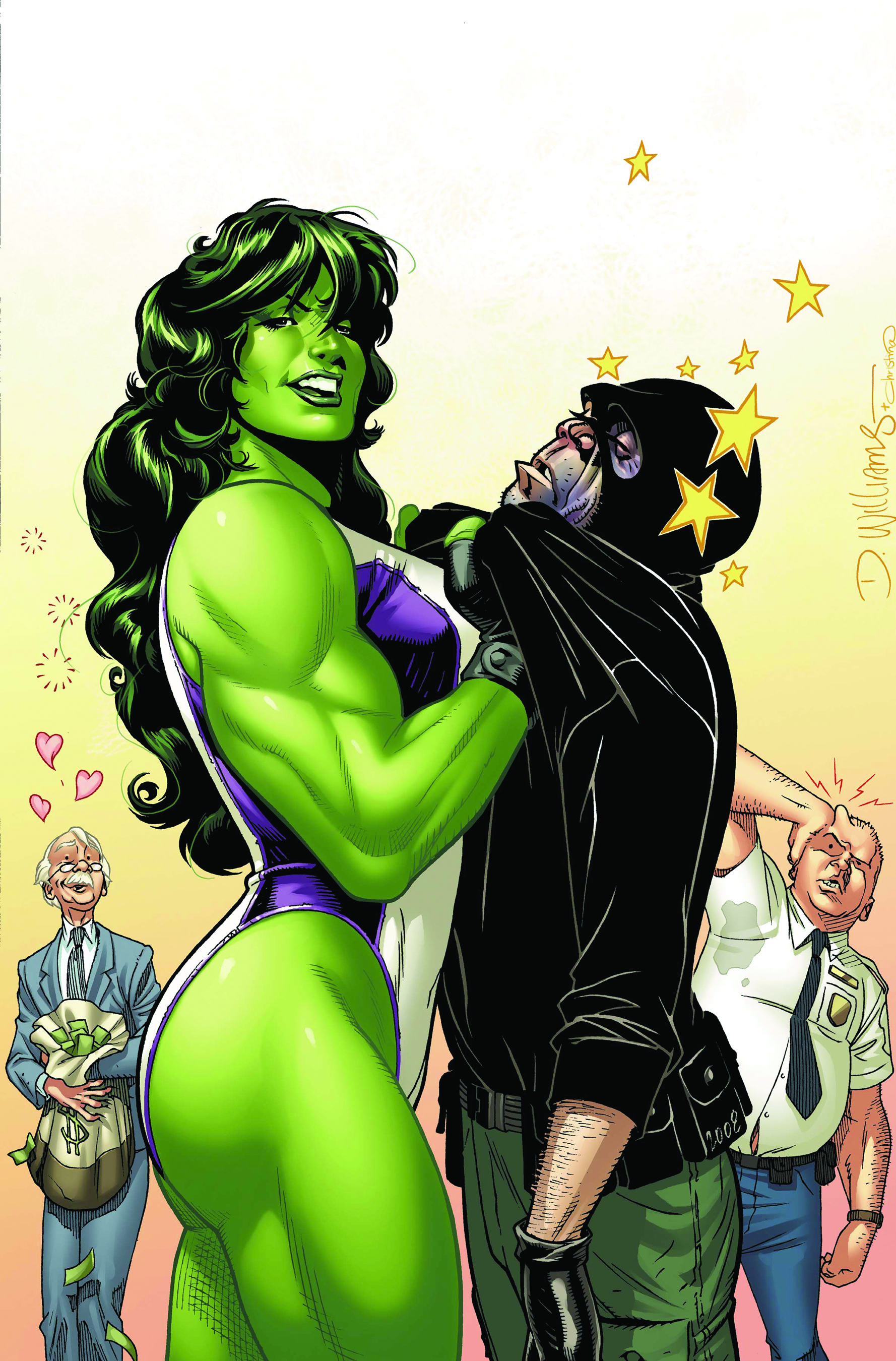 She's been savage. She's been sensational. She's been an avenger. She's been a lawyer. She's been a bounty-hunter. But there's one thing She-Hulk has always been, in all of her many series... cancelled. But it hasn't stopped her yet! In this oversized final issue, Peter David brings his run on the Jade Giantess to a close... but can Jen use her last remaining pages to save her friends from a truly mammoth threat? Catch her now, before someone turns her red!