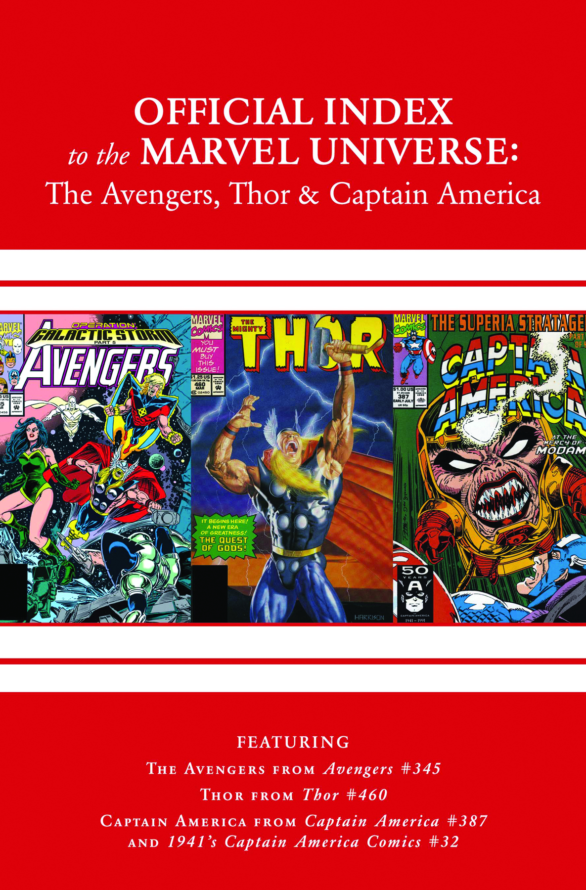 The chronicle of the Marvel Universe returns as the All-New Official Index to the Marvel Universe delves into the history of three more of Marvel's most enduring titles! Return with us to the Silver and Golden Ages to we launch our coverage of the Avengers (from AVENGERS #345), Thor (from THOR #460), and Captain America (from both CAPTAIN AMERICA #387 and 1941's CAPTAIN AMERICA COMICS #32). Watch the Marvel universe's history unfold month by month as each issue provides synopses for dozens of individual comics, including back-up strips, introducing the characters, teams, places and equipment that appeared within, providing vital information about first appearances, where they last showed up and where they appeared next!