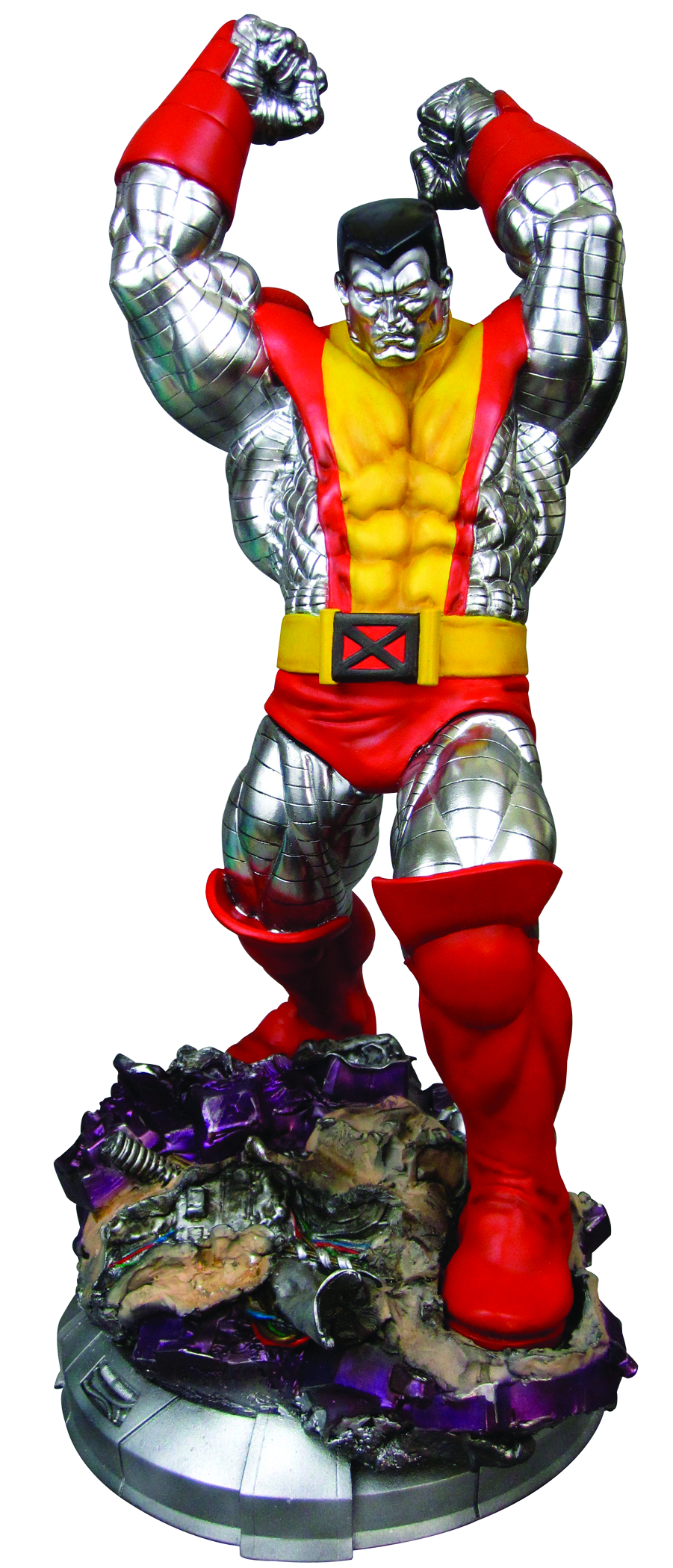 Inspired by Jim Lee's 1990's era X-Men, Colossus is a massive and unstoppable force. The massive mutant is posed triumphant on the field of battle, about to bring down his heavy fists to crush the last of his wrecked foes. With his powerful physique transformed into living metal, Colossus has a fantastic sculpt showing off each and every muscle wrapped in smooth, narrow bands. He wears his classic bright red and yellow costume that's decorated at the waist with a large red and black "X" logo. Everywhere his "skin" is exposed is bright metallic silver, except for his black hair, making Colossus very visually dynamic. But that's not all. You even have two cool options when it comes to displaying the X-Man as he comes with two interchangeable heads: the first is angry yet focused, while the second is a sheer mask of rage!
