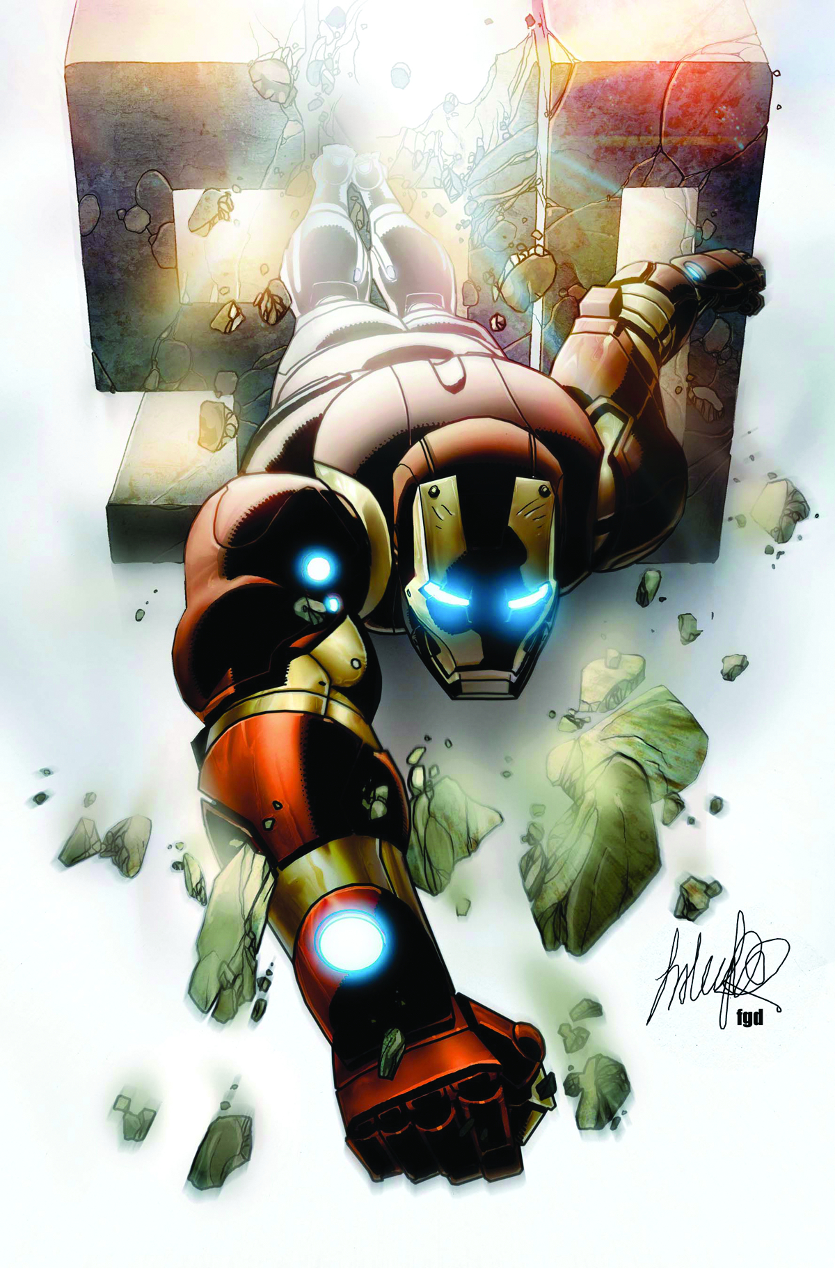 From Marvel Comics. Giant-sized Anniversary Issue! Three generations of Starks face their ultimate foe seventy-some years in the future while, in the present, Spider-Man joins Iron Man as he tries to fill in the blanks of his missing memory. What if amnesia was a weapon? What if the smartest man in the land had ten nightmares that all came true? Who is the son of Tony Stark? What's inside of the rings? The future starts now, for the Marvel Universe's favorite futurist. The Eisner Award-winning series makes a four-hundred-something-issue leap and raises a glass of non-alcoholic Champale in salute to Ol' Shell-head! By Matt Fraction (