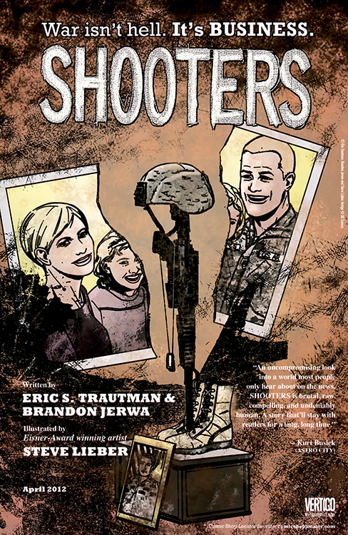Written by Eric S. Trautmann (CHECKMATE, Red Sonja, Flash Gordon) and Brandon Jerwa (G.I. Joe, Battlestar Galactica, Highlander), and drawn by Eisner Award-winning artist Steve Lieber (Underground, Whiteout, ROAD TO PERDITION: ON THE ROAD), SHOOTERS tells a story of modern warfare that will stay with you forever.