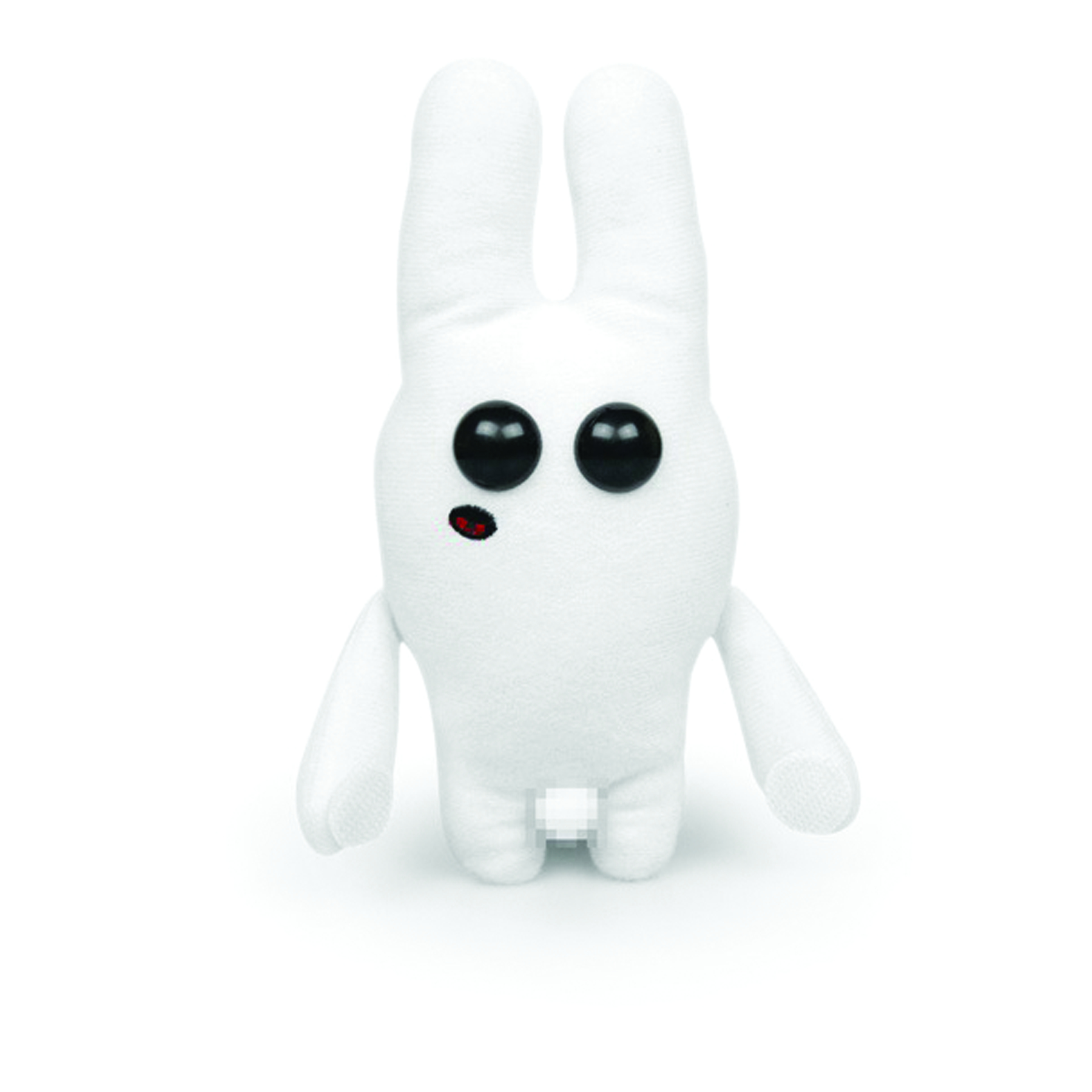 Nuddy The Naked Rabbit likes to walk around in his Nuddy-pants. Sometimes when he feels busted "Hazmate" (the red warning sign) is there for him to cover his naughtiness. The cute expression on his face together with the red sign of "extreme danger" has to induce confusion and curiosity, like a bitter pill that looks like an attractive sweet candy. The small red plush cross is attached by velcro to the rabbit plush. Standing 6 5/8" tall, Nuddy is limited to 300 pieces.