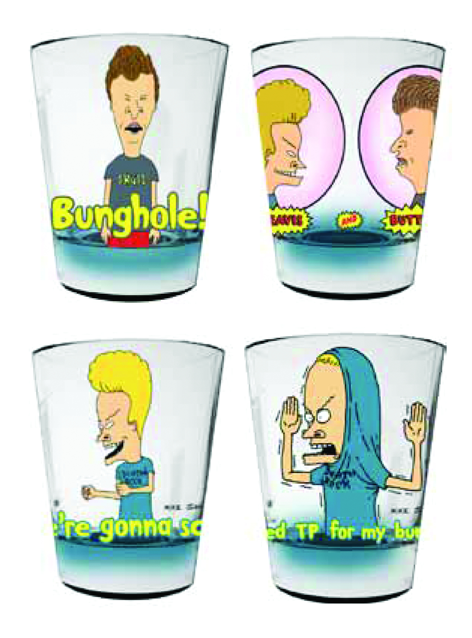 Drink Beavis and Butthead, the stars of the eponymous animated series on MTV, under the table with this 4-piece shot glass set featuring the characters from the celebrated Mike Judge series!