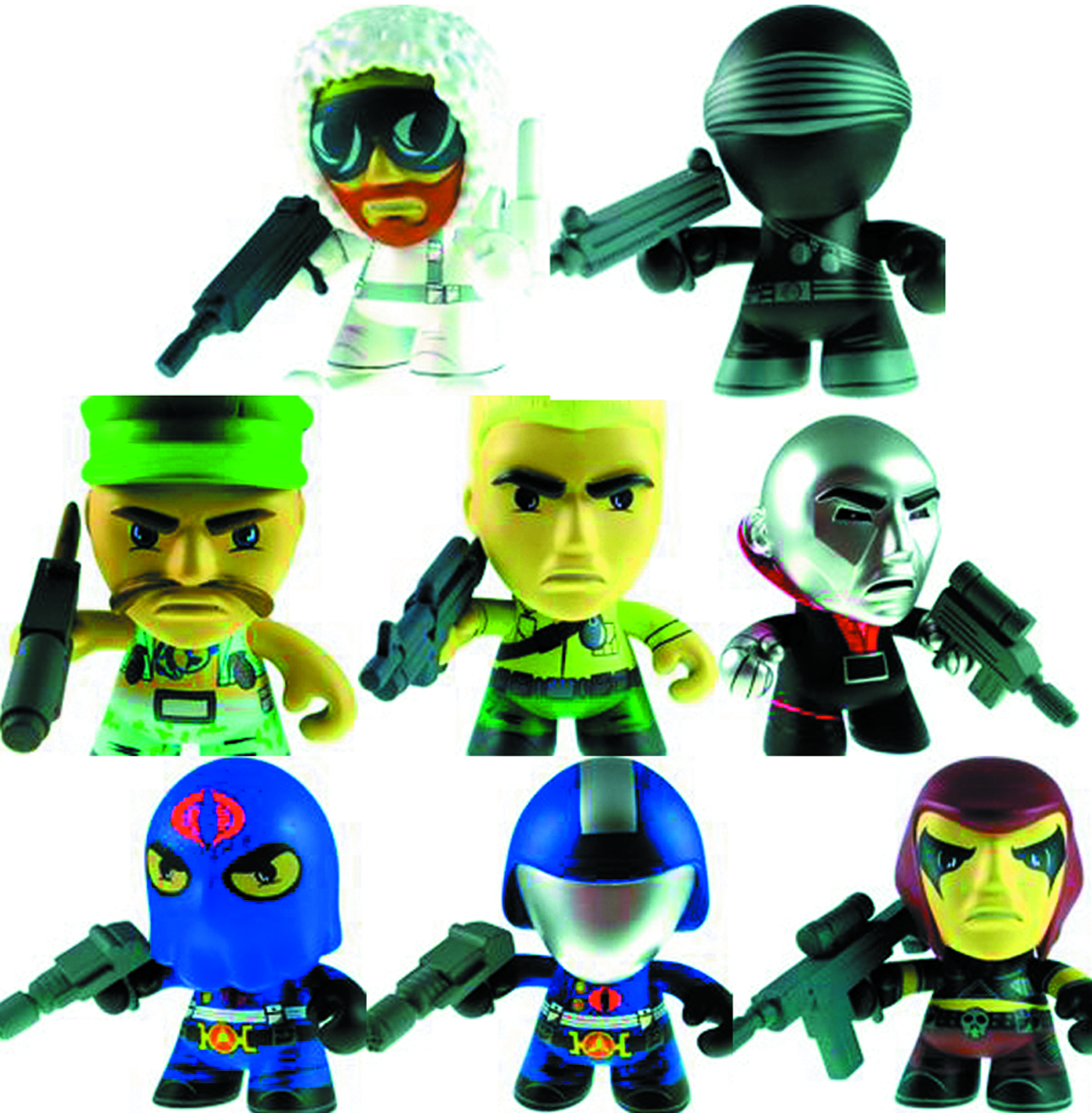 G.I. Joe characters for a line of vinyl mini-figures! These new designs feature Duke, Destro, Cobra Commander and more in a super-deformed style. Each figure ships in a foil bag, are articulated in each arm and at the neck, and feature a scaled weapon from their original 3.75" release. Designed by Les Schettkoe, these blind mystery boxed figures prove that NOT knowing is half the battle (and fun)! Collect them all!