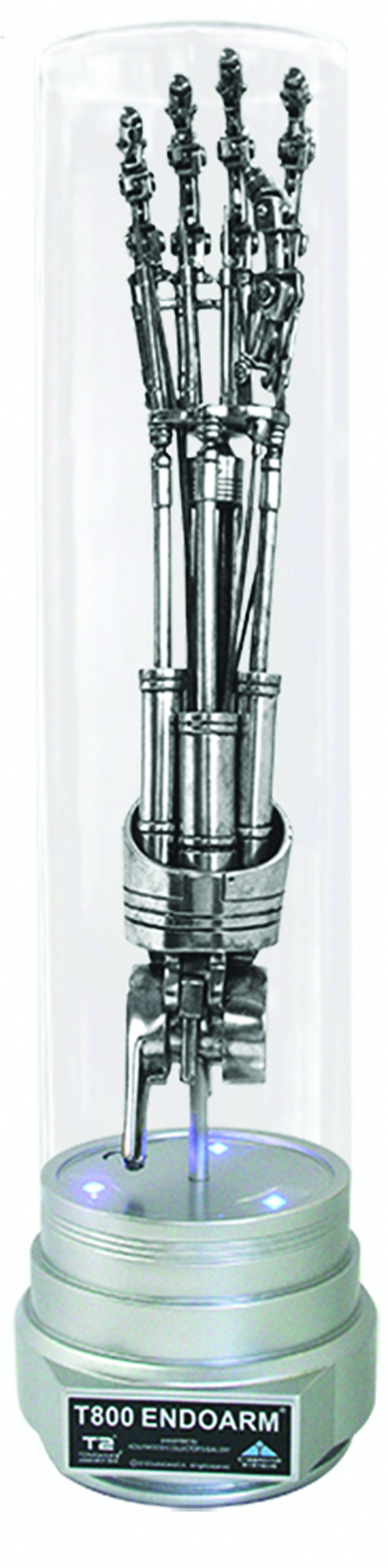 Terminator 2: Judgment Day comes this exciting new licensed prop replica, the Endoskeleton Arm! This was first seen in the Cyberdyne break in scenes being recovered by John Connor, along with the Terminator Brain Chip. This 1:1-scale replica was molded from an original screen used Endoskeleton arm, with the arm measuring 24" tall. The Endoarm has been recreated using a variety of materials, including polystone, fiberglass, and metal, and is triple chrome plated so it is cold to the touch for a real metal feel. The base incorporates built-in blue LED uplighting for enhanced display options, and the piece comes complete with a clear acrylic cover, as it is first seen in the movie! This is a must have for all