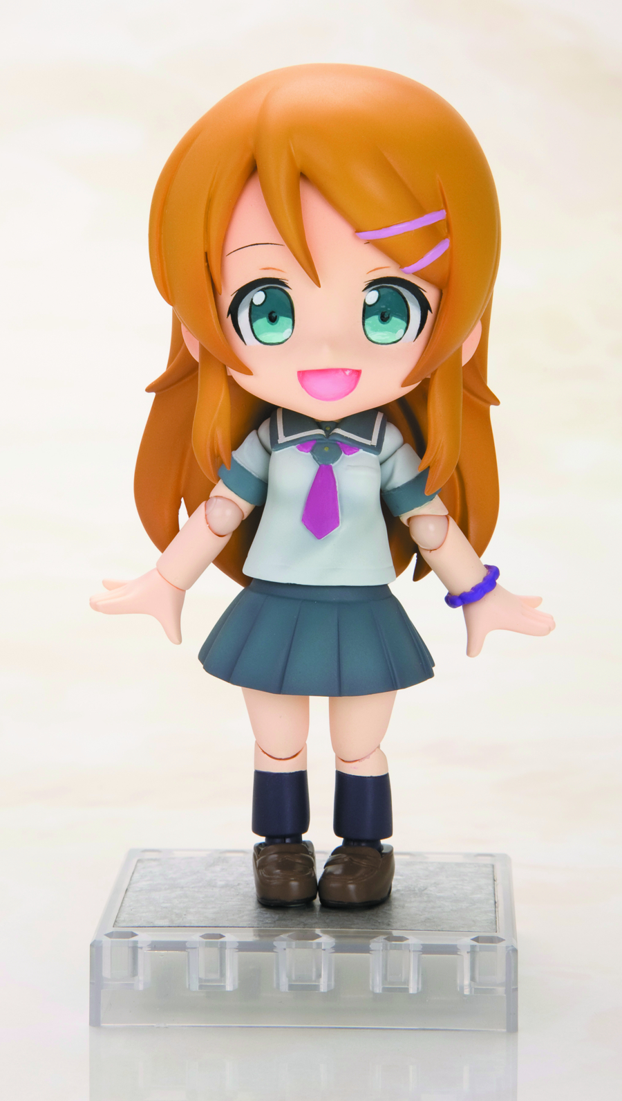 A KOTOBUKIYA Japanese import! For the third member of the new lineup of Cu-Poche figures, Kotobukiya returns to the popular Ore no Imoto ga Konna ni Kawaii Wake ga Nai ("My Little Sister Can't Be This Cute") franchise and the secretive and mature young girl KIRINO KOUSAKA! Combining poseability and stability, each Cu-Poche figure features multiple points of articulation and magnets in its feet for extra stability on the included base. The pretty young novelist and model looks adorable in this super-cute "deformed" style, wearing her blue and white school uniform with red tie, purple bracelet, chunky brown shoes, and pink barrettes in her hair. With several different interchangeable face parts you can display Kirino with a variety of expressions from an eager smile to a pensive frown or silly eyes-closed look with her tongue sticking out! She even comes with special accessories: her cell phone and purse. Sculpted by Hideaki Ohya, Kirino stands almost 4 inches tall and has 14 points of articulation so you can pose her according to your wishes. She's great for fans of Ore no Imouto and collectors of the Cu-Poche series alike!
