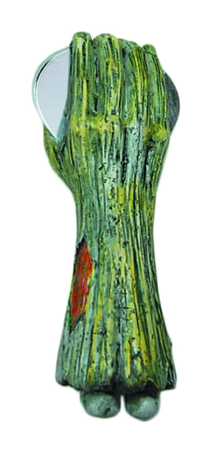 A PREVIEWS Exclusive! Feeling just "dead" at the end of the day? Well, let this little undead fellow lift your spirits with a nice cold beverage! A great addition to your barware, this nifty little polyresin bottle opener is shaped just like a zombie arm, complete with gross bitemarks, protruding bone, and an integrated "churchkey" in his "palm." The magnet lets your store it on your fridge for whenever you need to bring yourself back to life!