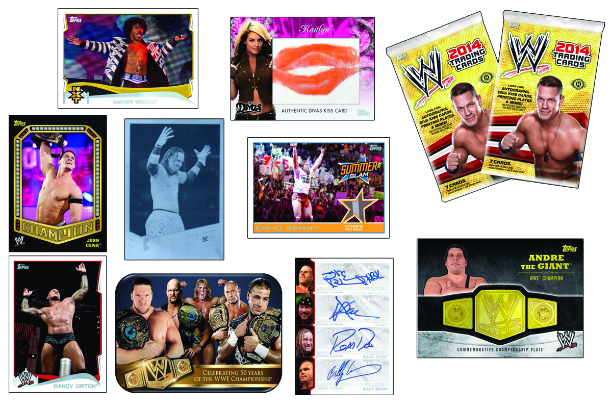 The only trading card of the WWE returns with more slammin' action! The extensive 190-card set includes a 110-card base set, 30 NXT Prospects, 30 WWE Champions, 20 Greatest Championship Matches, 10 Greatest Contenders, and the 10-card Stone Cold Steve Austin Tribute. Plus, there are 4 levels of chase cards to add depth to the base set. WWE 2014 will feature autographs, triple autographs, and new quadruple autographs. Collector favorite Diva Kiss Cards return in WWE 2014 with Autographed Kiss cards. Plus, WWE Relics give fans a chance to own a piece of the WWE. For the first time ever, WWE Rookies will receive a "Rookie" emblem indicating their first appearance on a Topps WWE base card. 7 cards per pack, 24 packs per box.