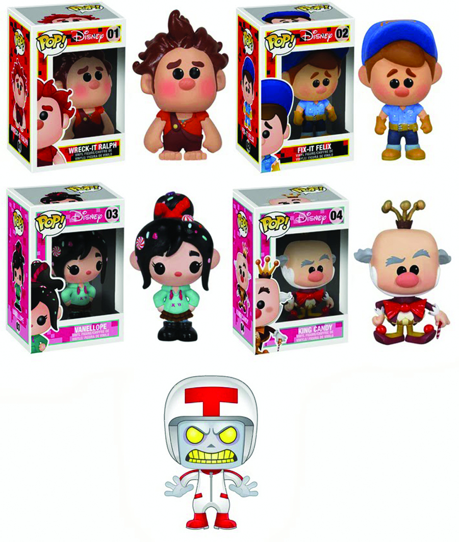 Disney's Wreck It Ralph takes audiences inside the world of video games and the characters who live inside them, and Funko brings the characters from the film to life with their new line of POP! Wreck It Ralph Vinyl Figures! These 3 3/4" tall figures of Ralph, Felix, King Candy, Vaneloppe, and Turbo have the urban stylized design that have made these figures so popular. Collect all five! Window box packaging.