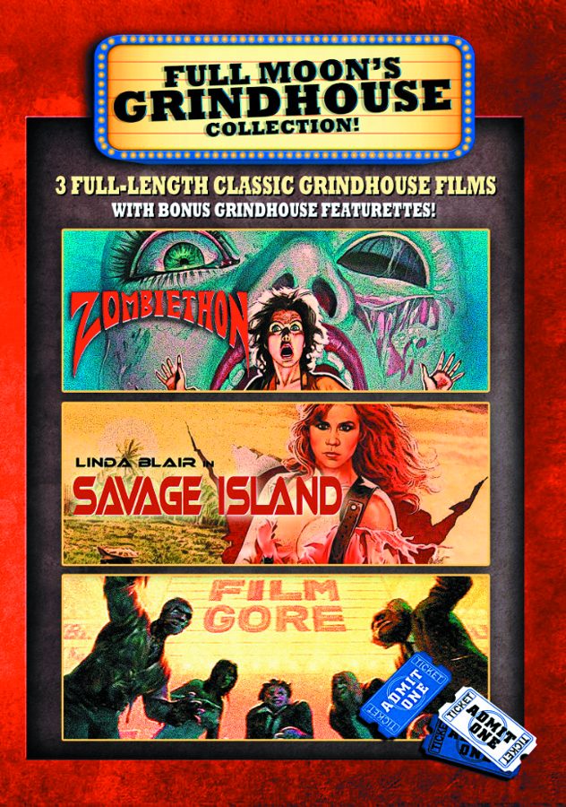 From Full Moon Presents! Grindhouse 3-Disc DVD amaray 3-pack set includes Zombiethon, Filmgore, and Savage Island, starring Linda Blair of The Excorcist.