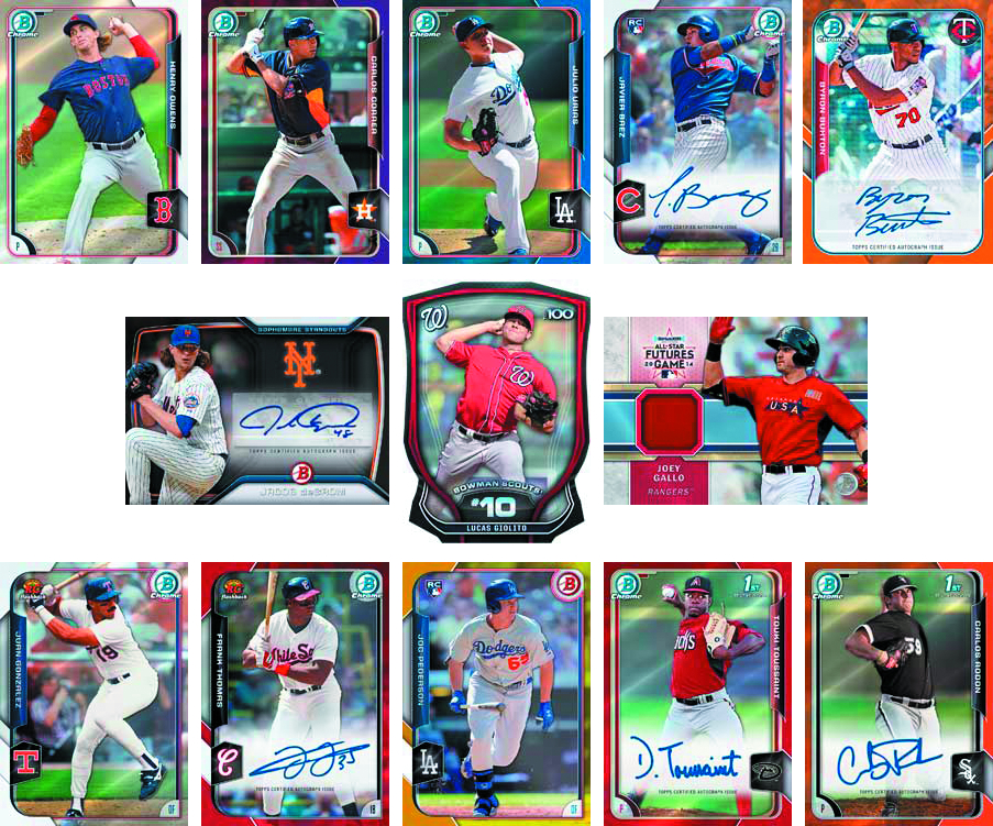 Bowman Baseball returns in 2015 to establish the year's prospect and rookie trading card market! 2015 Bowman Baseball will place even more of an emphasis on thematic insert content and the game's up-and-coming prospects while continuing to deliver the autographed content that collectors expect from the Bowman brand. This year's flagship release will comprehensively cover the youngest stars of MLB and will become a collecting staple with its colorful parallels, chrome autographs, and extended prospect checklist. Look for 40 additional up-and-comers, with 150 base chrome prospects in total. In addition to the base chrome cards, up to 60 subjects will be featured with a Chrome Prospect Autograph card that showcases an on-card signature. Don't miss your opportunity for the most comprehensive flagship prospect product to date! 10 cards per pack, 24 packs per box. 32 cards per jumbo pack, 12 jumbo packs per box.