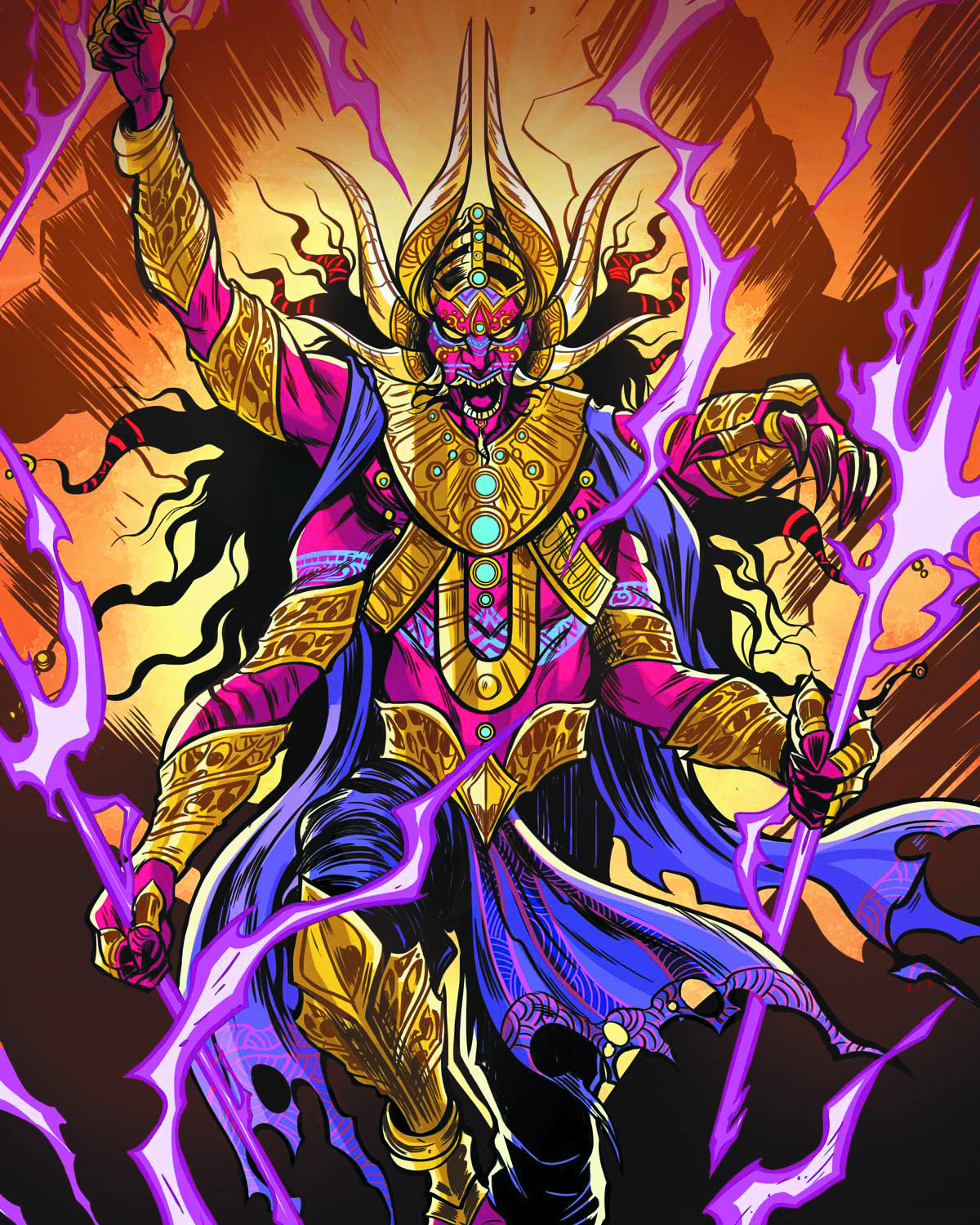 From the mind of legendary creator Grant Morrison, a perfect jumping-on point and stand-alone issue for new readers. We take a break from the battlefield to discover how the seeds of this battle between two great families were planted ages ago, when the mighty warriors we see on the battlefield today were mere children. We learn how Arjuna and Duryodhana, tragic rivals in war today, were the best of friends in their youth as they go on a forbidden demon hunt in the forests of the ancients.