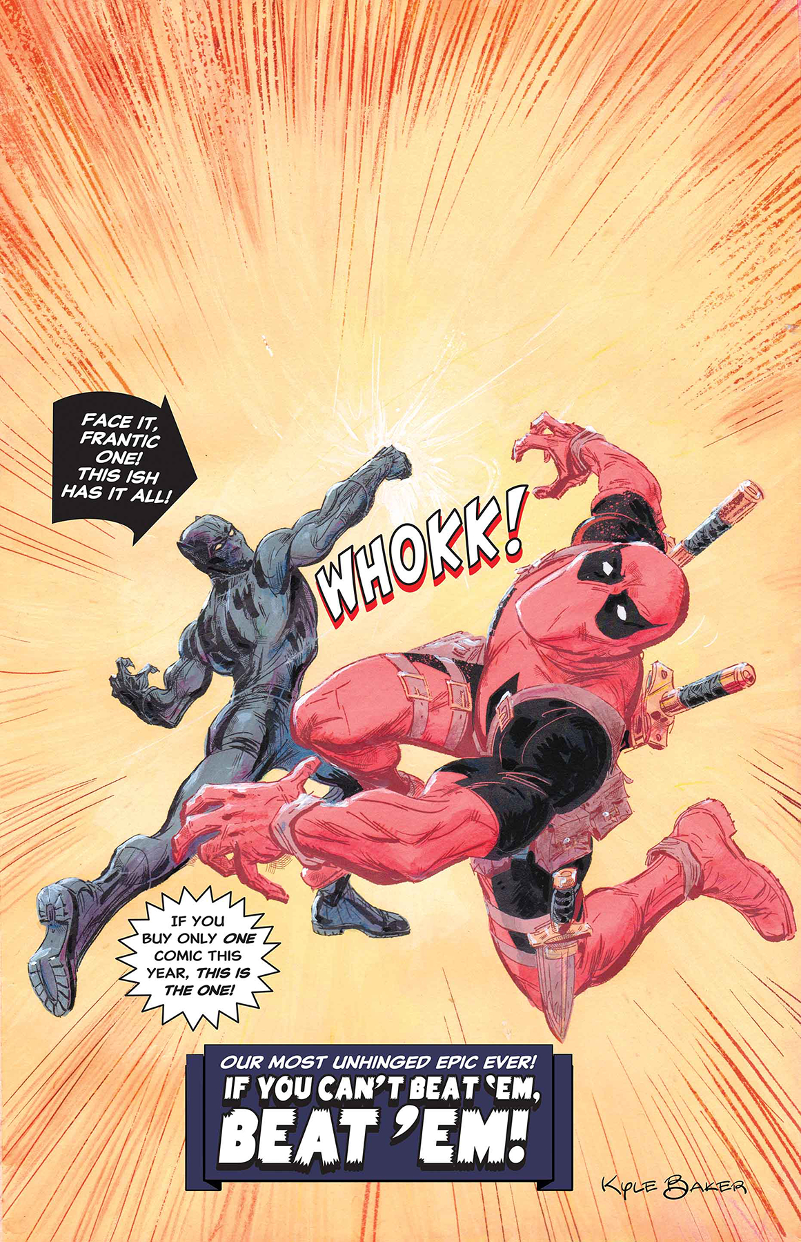 Or at least one person will come very, very close to dying! Probably! It's hard to tell with these team-up books! But one thing's for sure: This is the end. And there's a reason Wade Wilson is known as DEADpool. Will he obtain the Vibranium he needs to save Willie Lumpkin's life? Will the Black Panther chase immortality to stop him? Will Wade's teleporter ever work properly? Find out here!