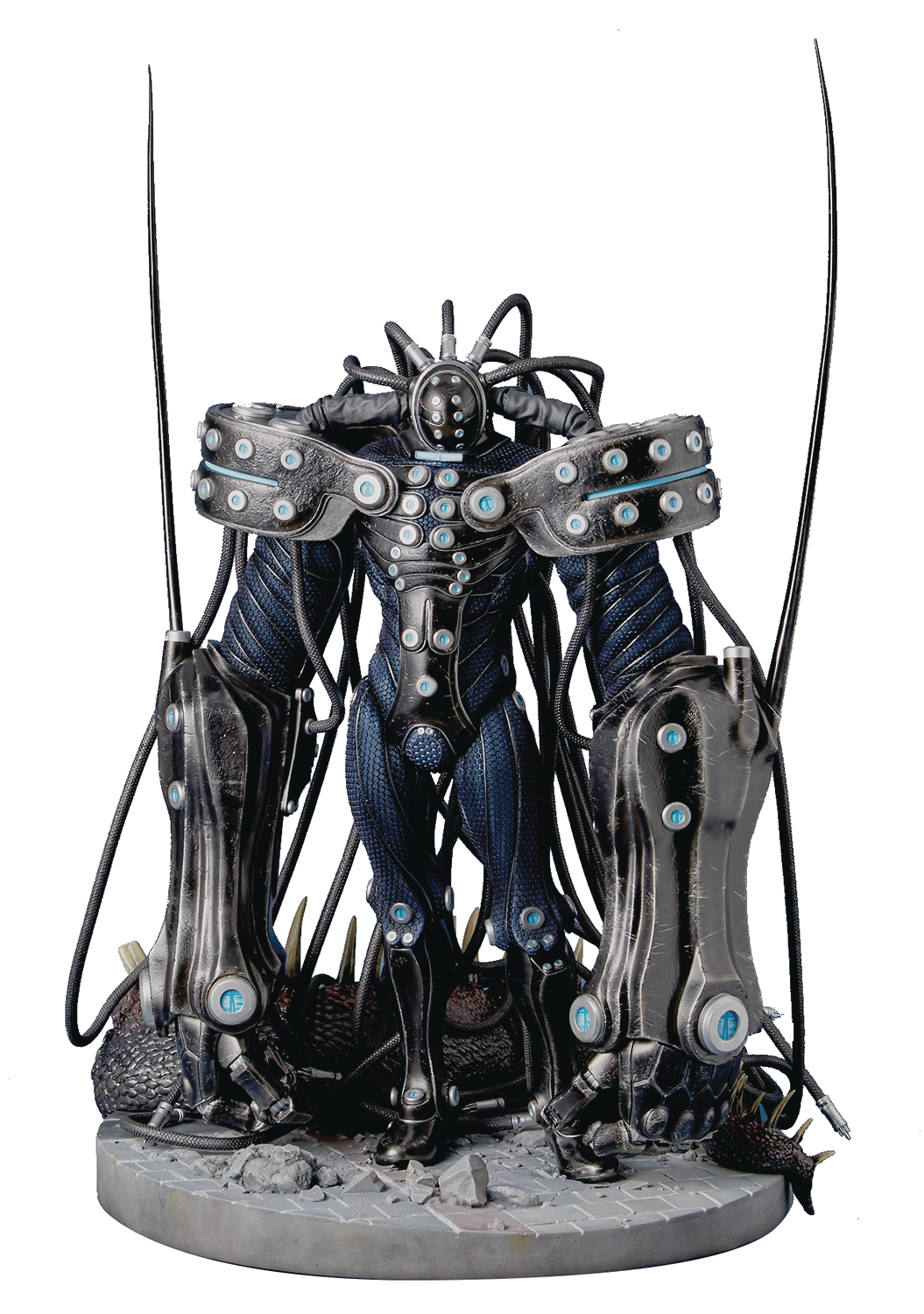 Hachiro Oka, armored in his Hard Suit, famous for scoring 100 points 7 times, is now recreated with overwhelming volume and presence. The production of this complex design utilizes a complex blend of high end materials including Polyurethane Resin, Polystone, ABS, PVC and Soft Vinyl to recreate every detail at a mass production level, and the details and textures of the suit all sculpted digitally, are faithfully recreated capturing the finest details like damage inflicted during his battles! The dreadlock style cords attached to his head have bendable metal wire embedded inside allowing for unique pose-ability and the detachable mask reveals