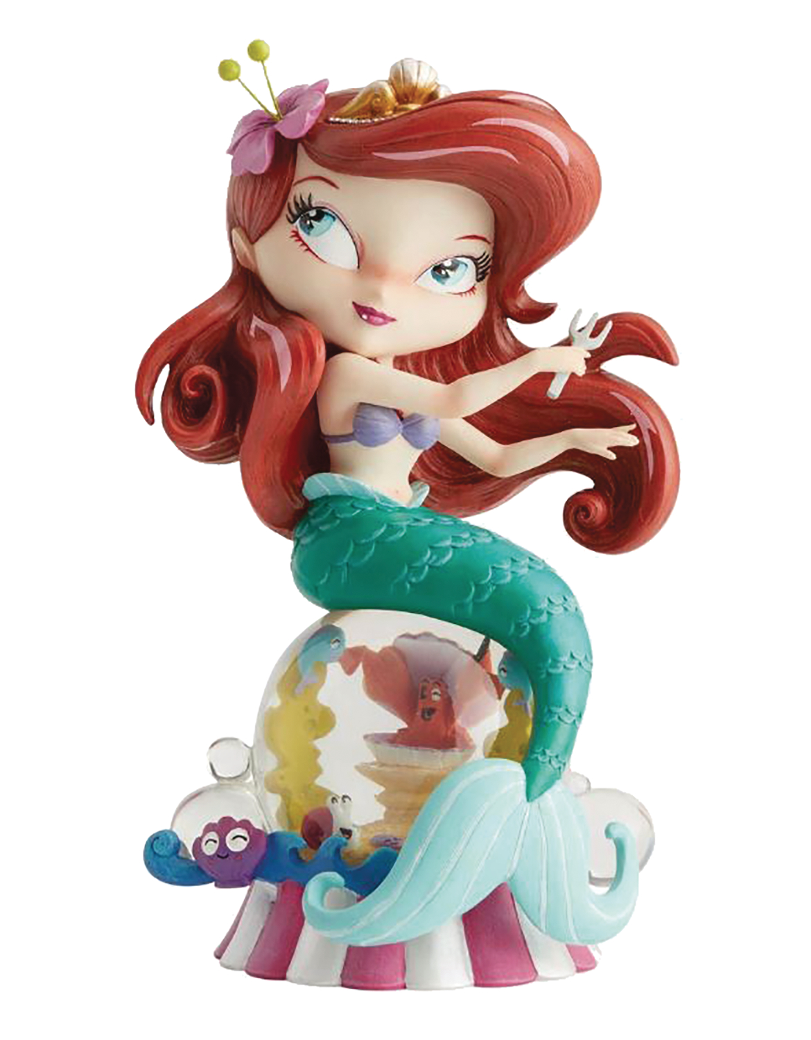 Designed by the inimitable Miss Mindy, the Disney: The World of Miss Mindy: The Little Mermaid Statues take one back to the beloved animated classic that kicked off the Disney animation renaissance! A dinglehopper is a girl's best friend, according to The Little Mermaid. Ariel (9 1/4" tall) is featured here on a glass bubble that lights up to reveal her loyal advisor, Sabastian, in a battery operated and requires 3x "LR44" batteries. Flounder (4 1/2" tall), with his iconic blue and yellow stripes, is perched on top of a bright pink piece of coral, complete with an orange starfish. Villainous vixen Ursula (9 7/8" tall), with her two sneaky henchmen, Flotsam and Jetsam, enwraps a light-up depiction of Ariel and Prince Eric from the musical number "Kiss the Girl." Each piece in the collection is made of polyresin and calcium carbonate.
