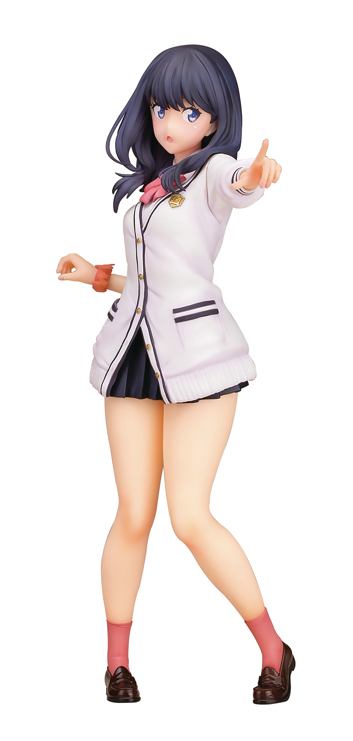 Rikka Takarada! She comes wearing her school uniform with her comfy white cardigan on top. Her cute pose shows off the nice curve of her thighs, and her expression is slightly surprised as she points ahead.