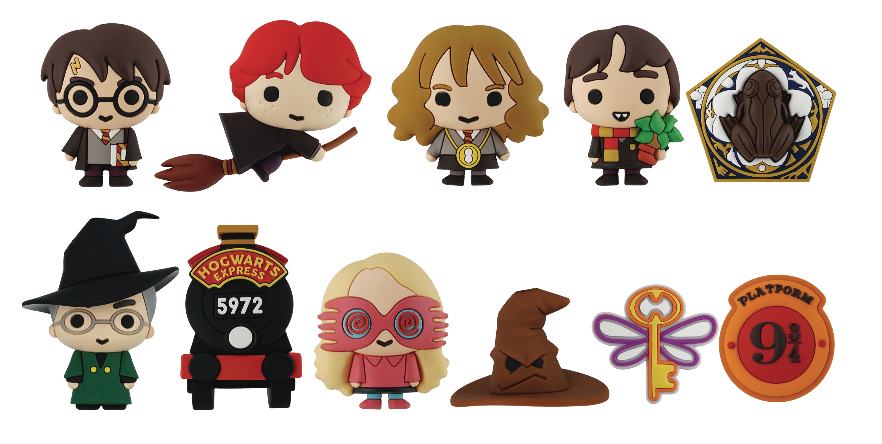 Organize your keys with beloved magical icons as the Hogwarts Express Train, Ron on a Broom, Hermione with her Time Turner, Neville with his plants, chocolate frog, McGonogall, Luna Lovegood, The Sorting Hat, and more! Each Harry Potter key ring is individually wrapped in a blind bag so each package is a delightful surprise!