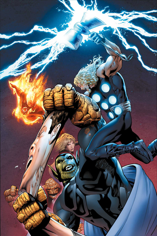 Get the body bags ready-because somebody doesn't make it home! The secret of the Super-Skrull is revealed as we find out what's really been behind Thor's ascendancy to the White House! Meanwhile, it looks like Ben Grimm's last stand, as he tries to save mankind from an alien menace! And on an Earth where all six billion people have a super power-with the exception of poor Ben-is that a curse or a blessing?